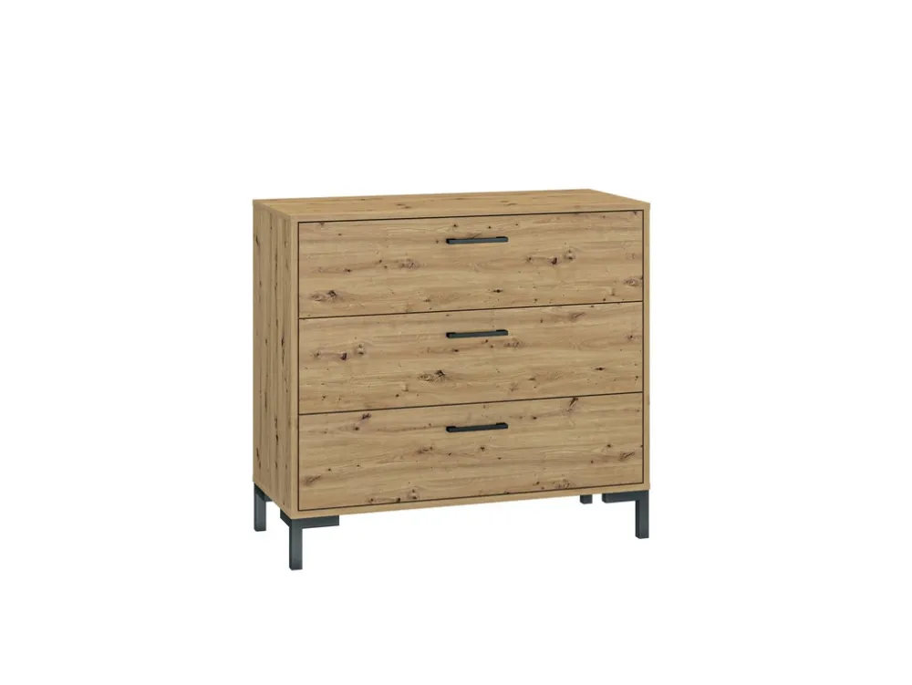 - Elegancka komoda NEVIO o szerokości 92 cm, wykonana z płyty laminowanej. Krawędzie zabezpieczono okleiną ABS. Komoda posiada trzy szuflady poruszające się na prowadnicach kulkowych. Posiada uchwyty i nóżki z tworzywa sztucznego w kolorze czarnym.