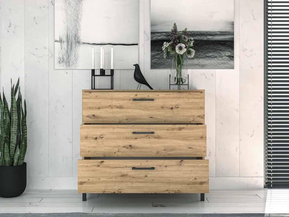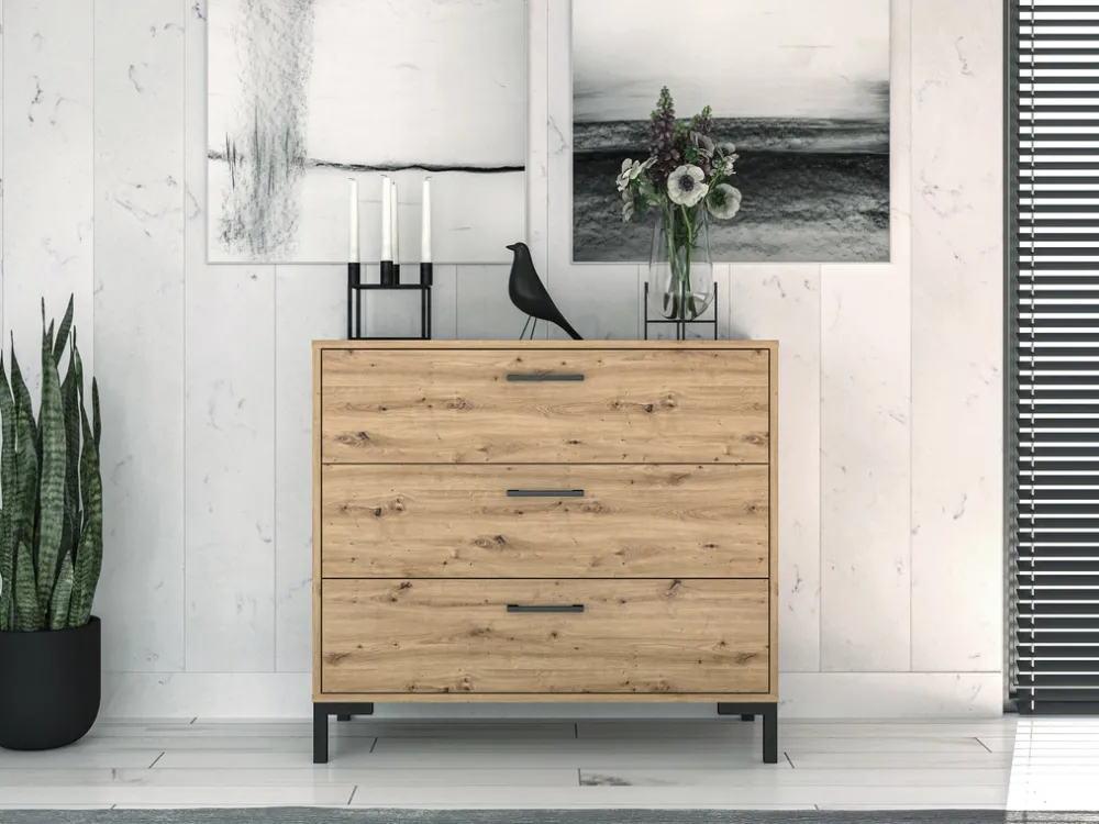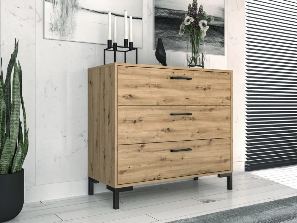 Komoda posiada trzy przestronne szuflady, które poruszają się na prowadnicach kulkowych. Dzięki temu otwieranie i zamykanie szuflad jest płynne i bezproblemowe, a dostęp do przechowywanych w nich przedmiotów staje się niezwykle wygodny. Szuflady oferują dużo miejsca na ubrania, dokumenty czy inne potrzebne w codziennym życiu przedmioty.