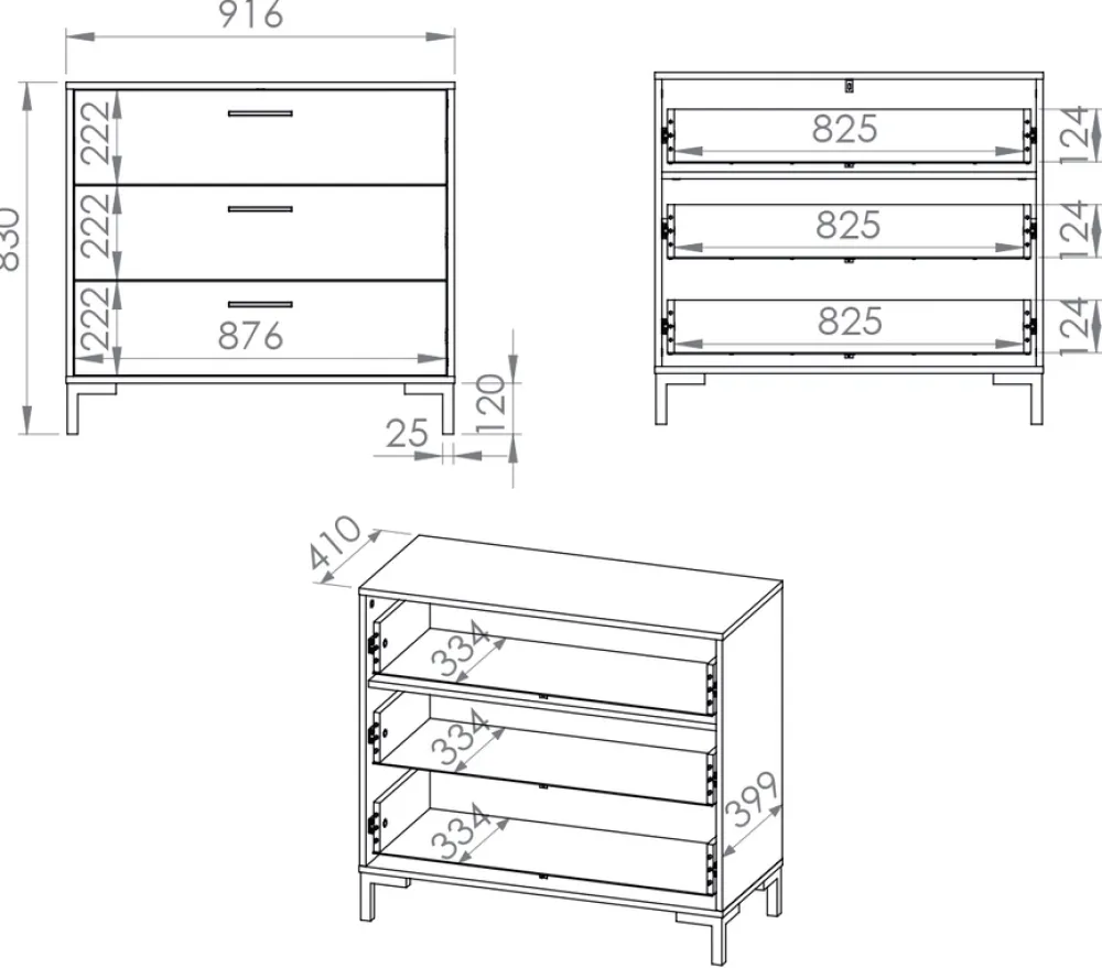 - Komoda posiada trzy szuflady, które poruszają się na prowadnicach kulkowych.