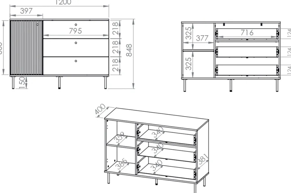 - Korpus oraz front komody wykonano z płyty laminowanej 16 mm, natomiast część frontu z lamelami wykonano z płyty MDF. Płyta laminowana charakteryzuje się odpornością na drobne zarysowania, a płyta MDF jest materiałem o wysokiej gęstości, co również przekłada się na jej wytrzymałość.