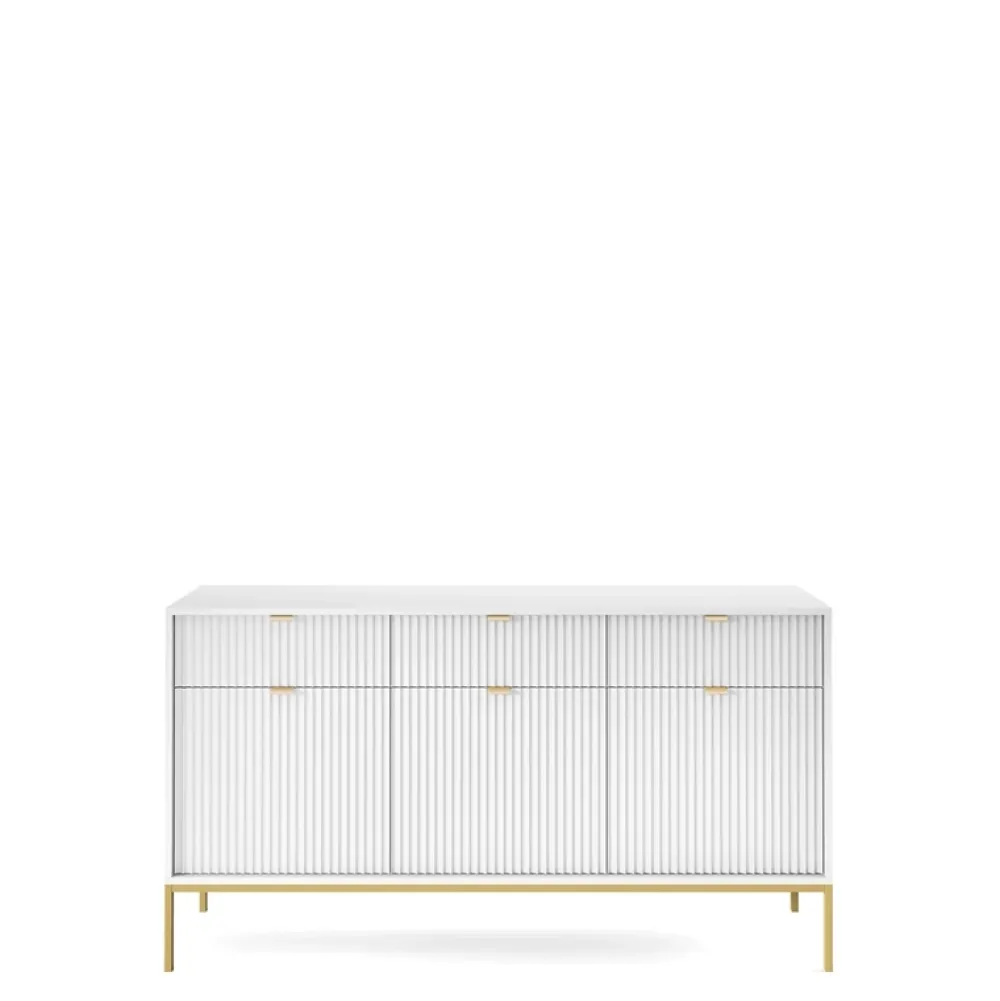 - Wykwintna komoda AVANTI w stylu glamour. Korpus w bieli kontrastuje z ryflowanymi frontami MDF, podkreślając ich wyrafinowany design. Złote, metalowe nogi dodają elegancji. Mieszanka funkcjonalności i luksusu!