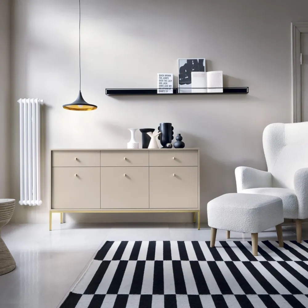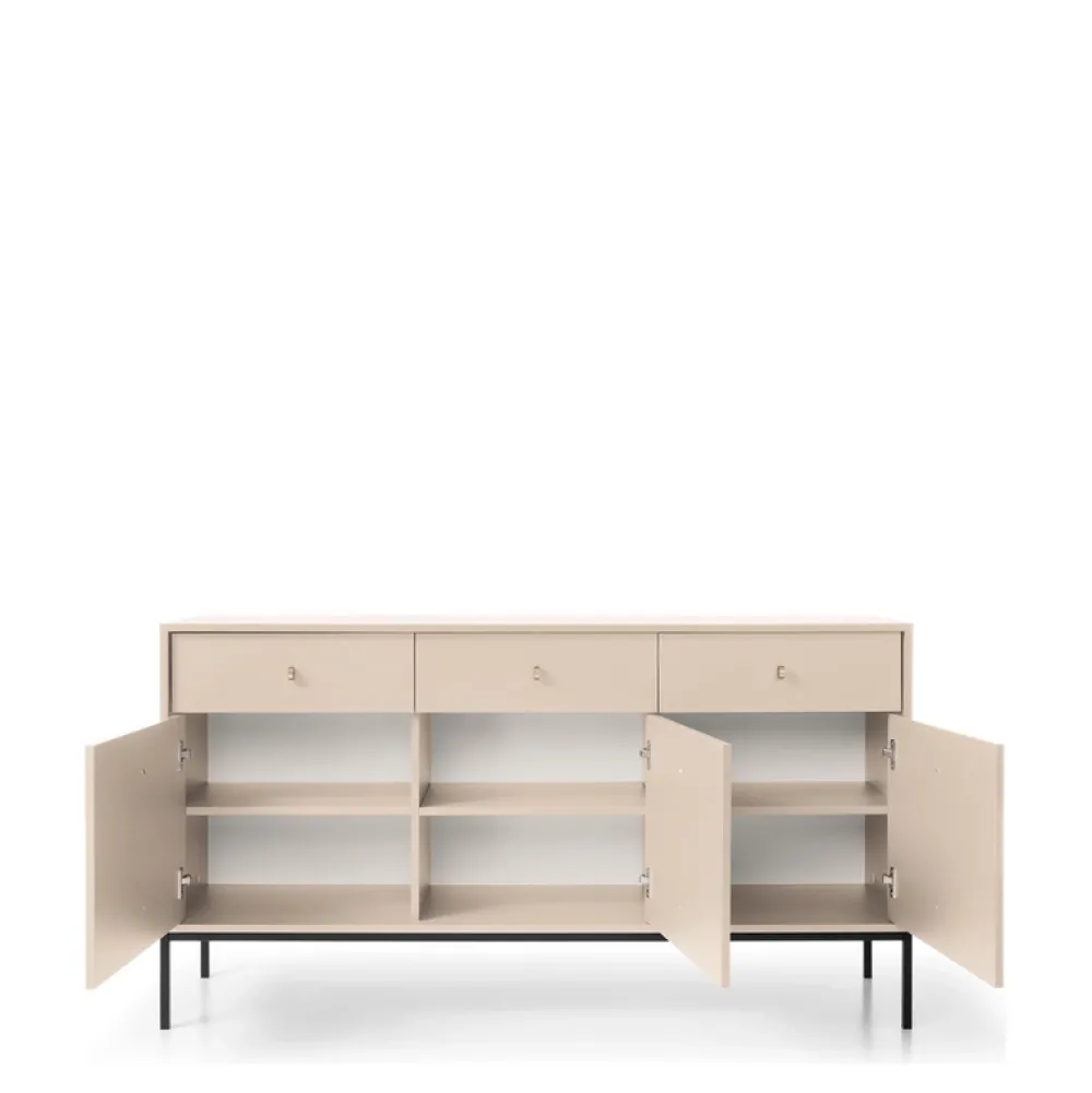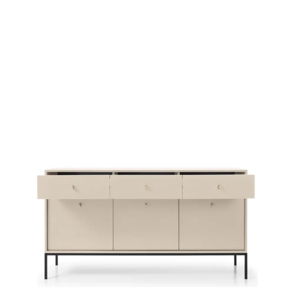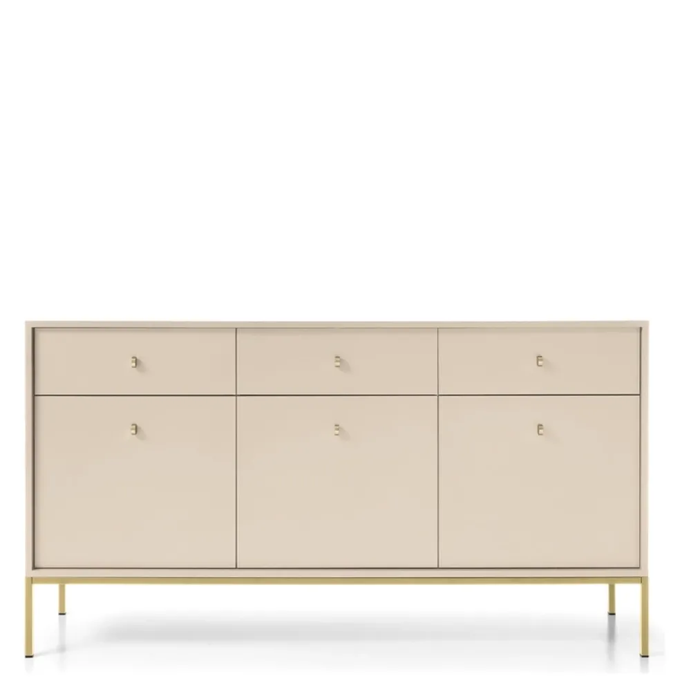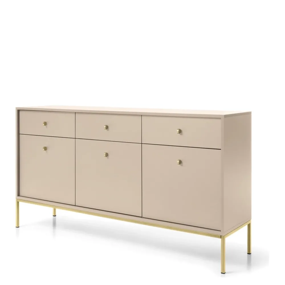 - Wyjątkowa komoda do salonu MONTI – beżowe wykończenie, złote metalowe nogi. Nowoczesna estetyka spotyka funkcjonalność z trzema drzwiami i szufladami. Dodaj blasku i elegancji swojej przestrzeni.