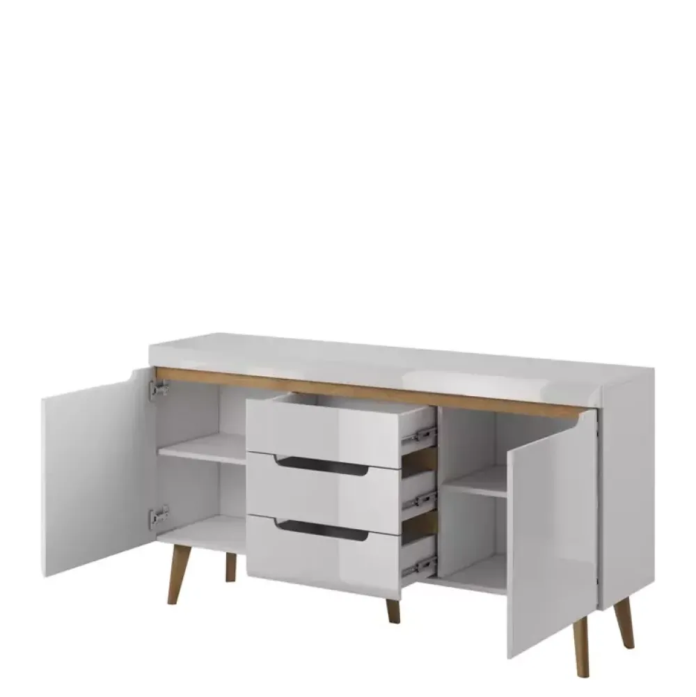 - Nowoczesna komoda z szufladami ma 160 cm szerokości i została wyposażona w trzy szuflady umieszczone w środkowej części mebla oraz dwie zamykane szafki po bokach.