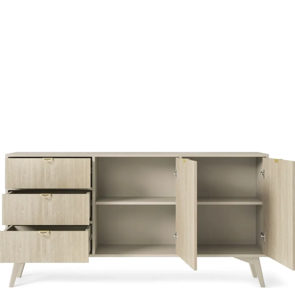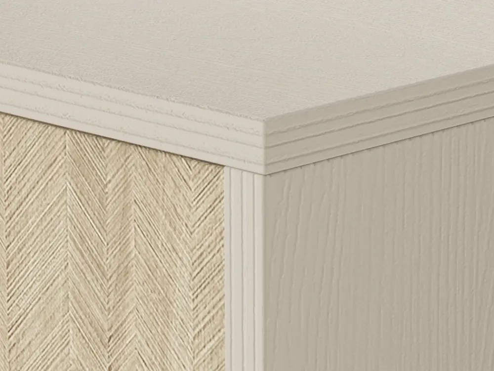To, co wyróżnia naszą komodę, to niepowtarzalny wzór jodełki scandi zdobiący jej fronty. Ten skandynawski motyw dodaje meblowi oryginalności i unikalnego charakteru. Eleganckie, złote uchywty z metalu dopełniają całości, wprowadzając do wnętrza odrobinę luksusu.