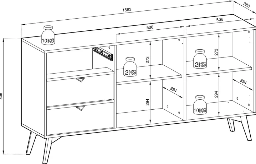 Dzięki trzem przestronnym szufladom, nasza komoda do salonu oferuje mnóstwo miejsca na przechowywanie najpotrzebniejszych przedmiotów. Bez problemu zmieścisz w nich dokumenty, akcesoria czy małe przedmioty dekoracyjne. Za każdym z dwojga drzwi kryje się praktyczna półka, co czyni tę komodę idealnym miejscem do przechowywania większych przedmiotów, takich jak książki czy gry planszowe.