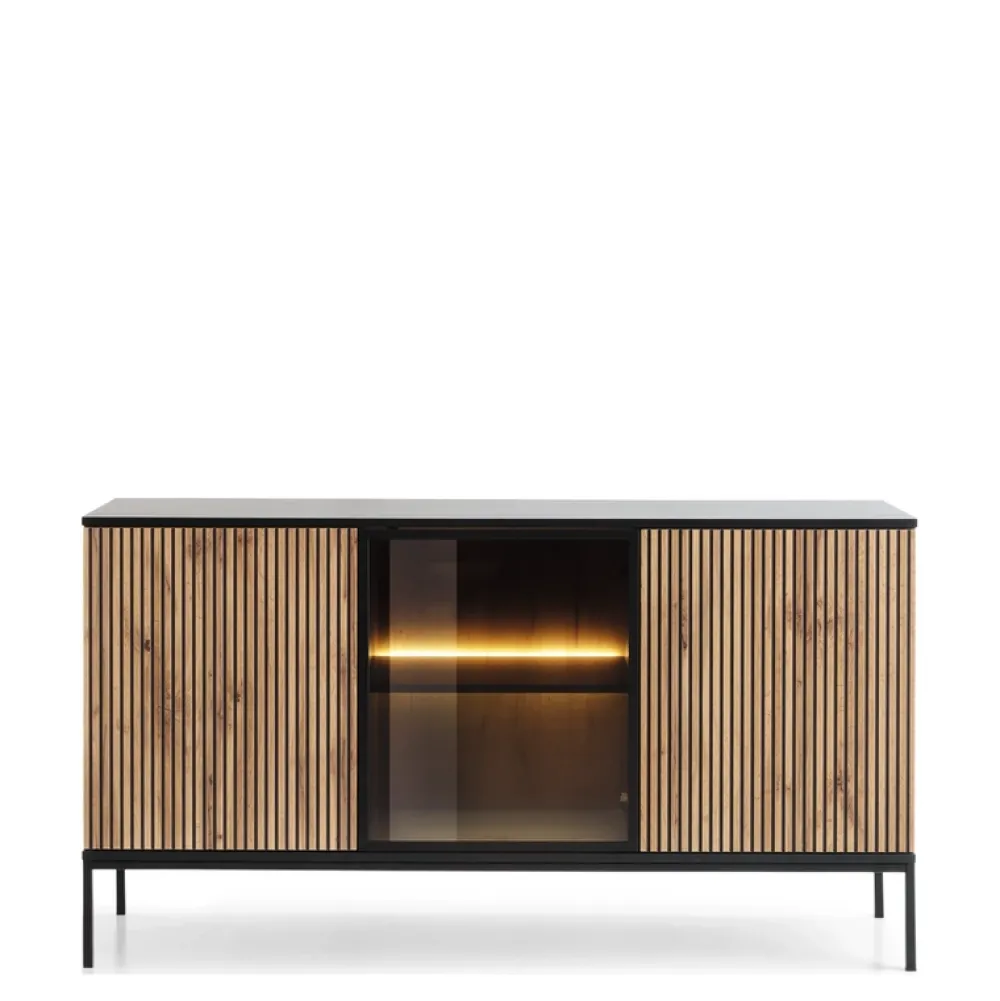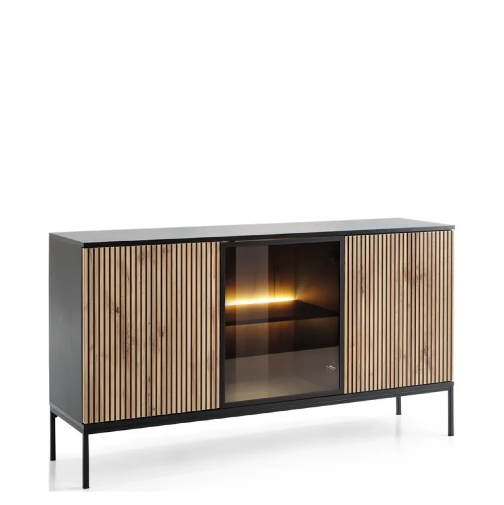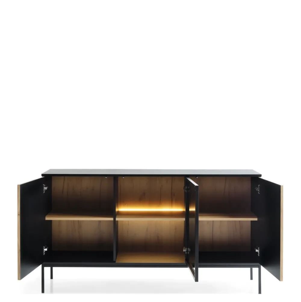 Za każdym frontem ukryta jest praktyczna półka, która zapewnia przestrzeń do przechowywania, sprawiając, że komoda jest nie tylko atrakcyjna, ale także funkcjonalna. Dodatkowo półka za szklanym frontem wyposażona jest w oświetlenie LED.