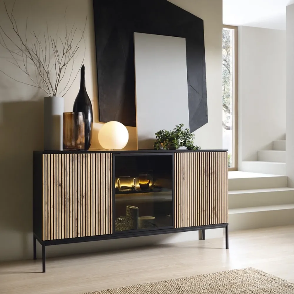 Centralny punkt komody stanowi front ze szkła hartowanego, barwionego na kolor antisol czarny. Ten kontrastujący akcent dodaje meblowi wyjątkowego charakteru i sprawia, że staje się on prawdziwym centrum uwagi każdego wnętrza.