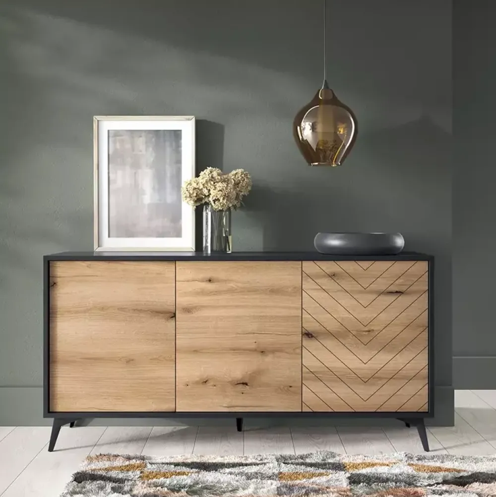 Duża komoda o szerokości 153,4 cm sprawdzi się w salonie, sypialni, ale także w biurze. Komoda została wyposażona w półki, na których ułożysz ważne dokumenty lub tekstylia. Na prawym froncie widnieje przepiękna jodełka. Komoda osadzona jest na czarnych, metalowych nóżkach o wysokości 14 cm. Komoda nie posiada uchwytów, ponieważ wyposażono ją w wygodny w użytkowaniu system push to open. Czarny korpus świetnie komponuje się z drewnopodobnym odcieniem dębu evoke.