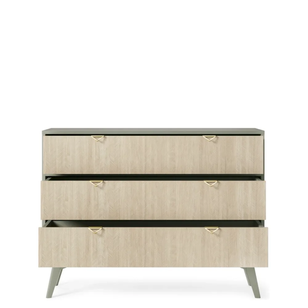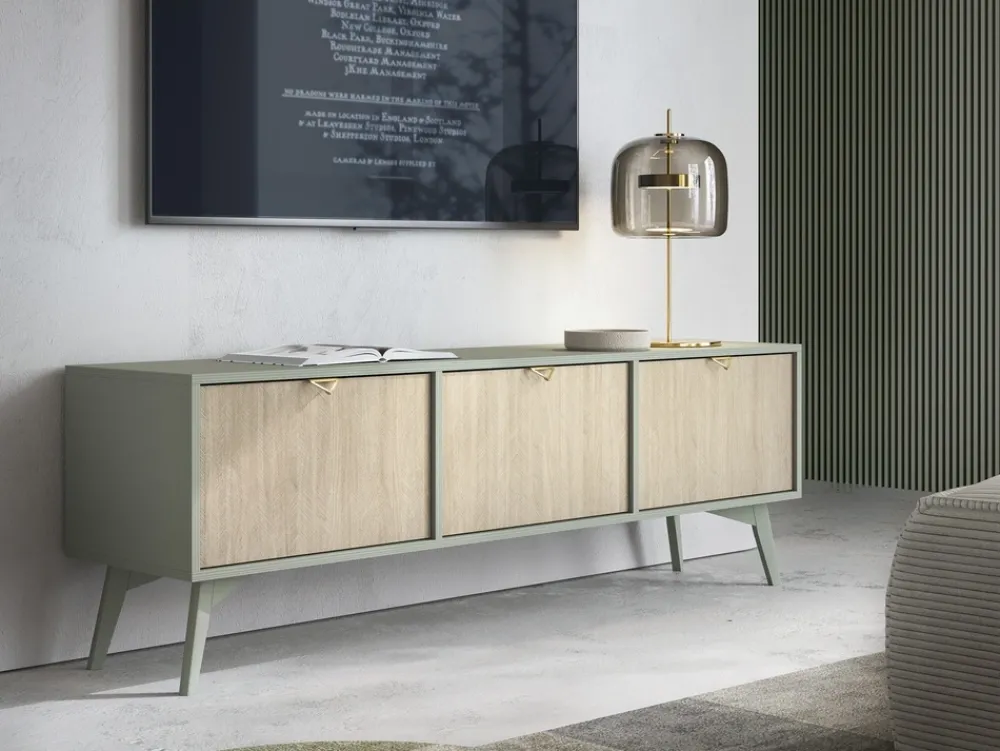 Meble posiadają wysokie drewniane nóżki nadające lekkości oraz eleganckie złote uchwyty wykonane z metalu. Obecny na frontach mebli wzór jodełki scandi świetnie będzie kontrastował z kolorem eukaliptusowej zieleni, w którym wykonano korpusy oraz wnętrza i nóżki mebli. Ta ciekawa kombinacja kolorystyczna wprowadzi do salonu świeżość oraz magiczny charakter.