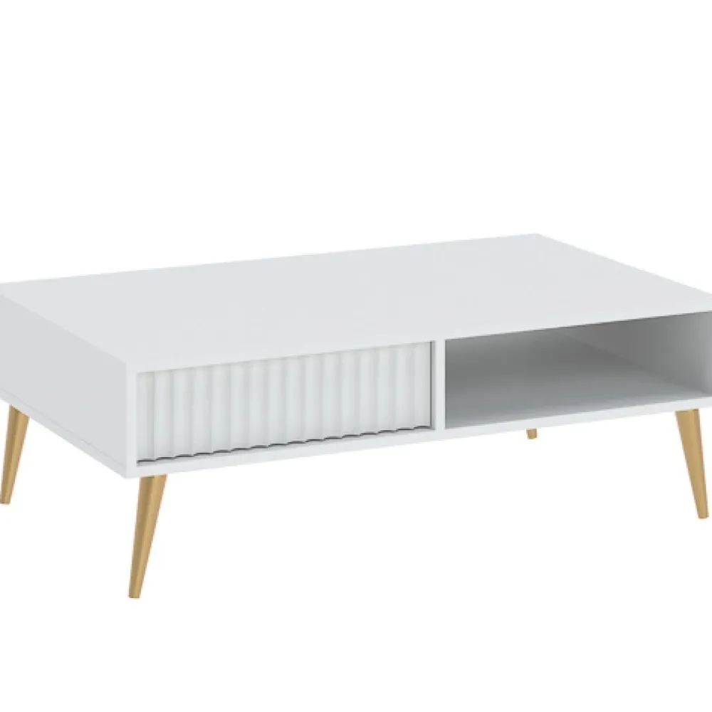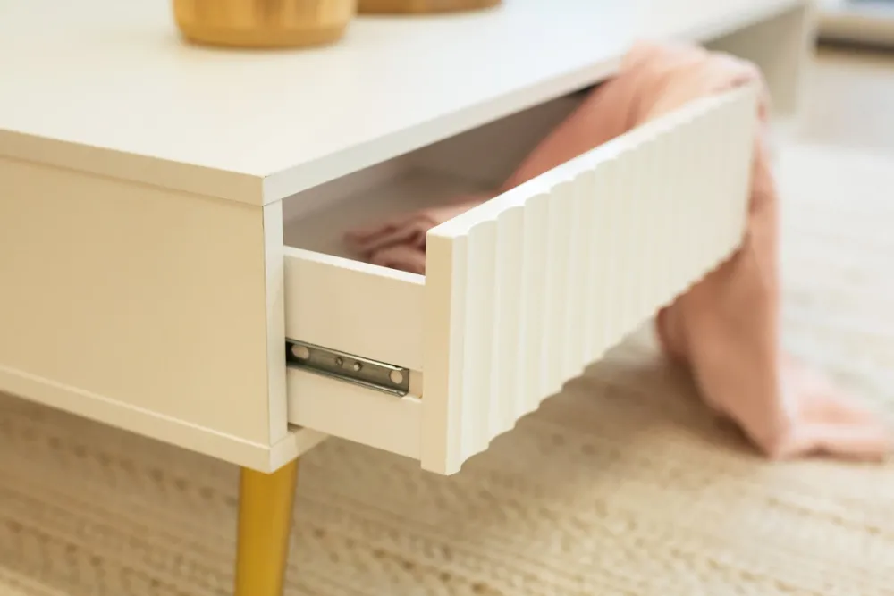 - Stolik kawowy BELLUNO posiada szufladę, która została osadzona na prowadnicach kulkowych. Front został wykonany z ryflowanej płyty MDF. Szuflada otwiera się za pomocą mechanizmu push to open, w celu jej otworzenia należy nacisnąć front.