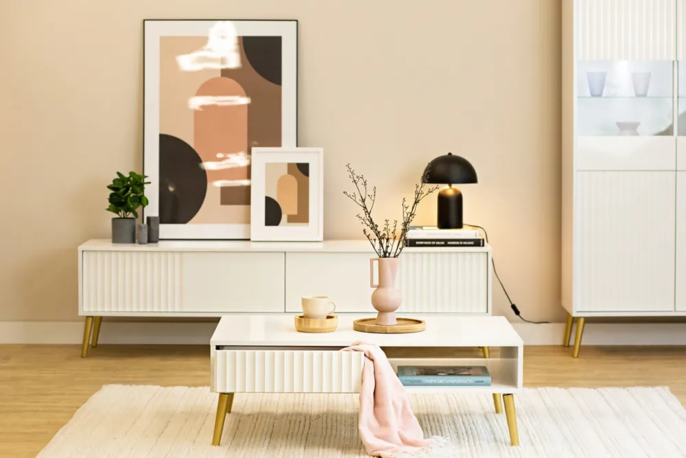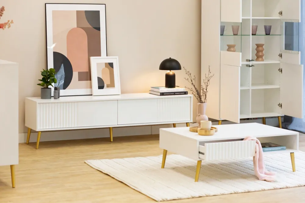 Stolik okolicznościowy BELLUNO to praktyczne i estetyczne rozwiązanie do każdego nowoczesnego wnętrza. Wyposażony w dwie pojemne szuflady oraz funkcjonalną wnękę pod blatem, idealnie sprawdzi się jako stolik kawowy lub pomocniczy. Fronty z ryflowanego MDF-u w eleganckim, matowym białym wykończeniu zachwycają subtelną strukturą, a system otwierania „push to open” zapewnia wygodę użytkowania bez konieczności stosowania uchwytów.
