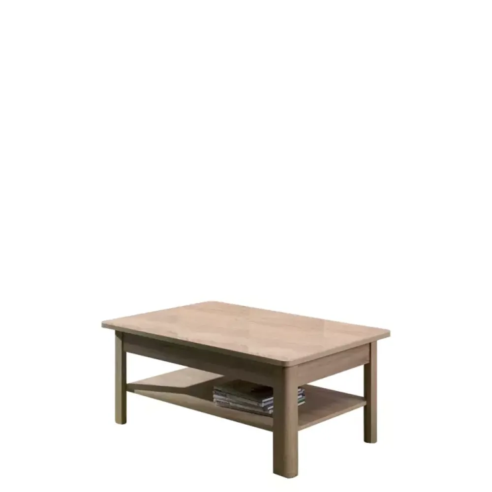 Ława została wyposażona w półkę, na której ułożysz ulubione czasopisma bądź inne przedmioty codziennego użytku. Blat w kształcie prostokąta o wymiarach 114×64