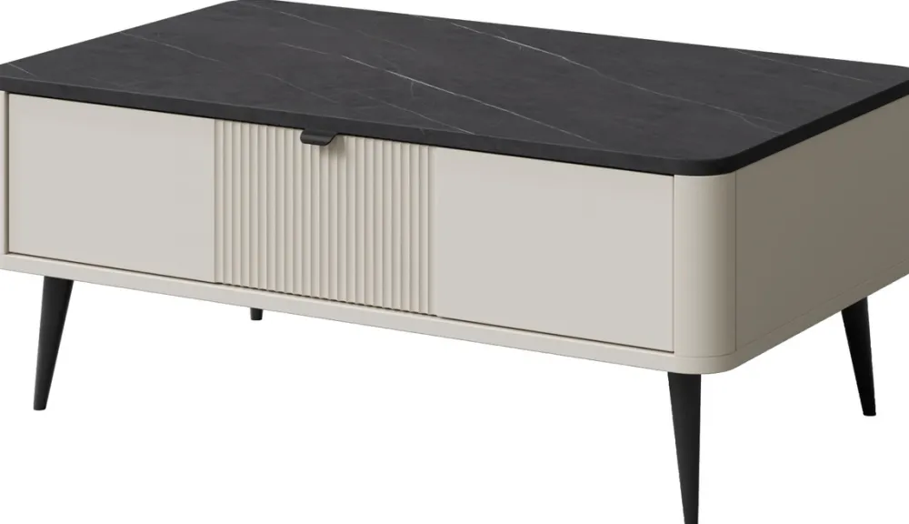 Stolik doskonale sprawdzi się zarówno jako centrum salonu, jak i praktyczny mebel do przechowywania pilotów, gazet czy innych codziennych drobiazgów. Dzięki nowoczesnej formie z łatwością wpisze się w aranżacje w stylu modern, loft czy japandi.