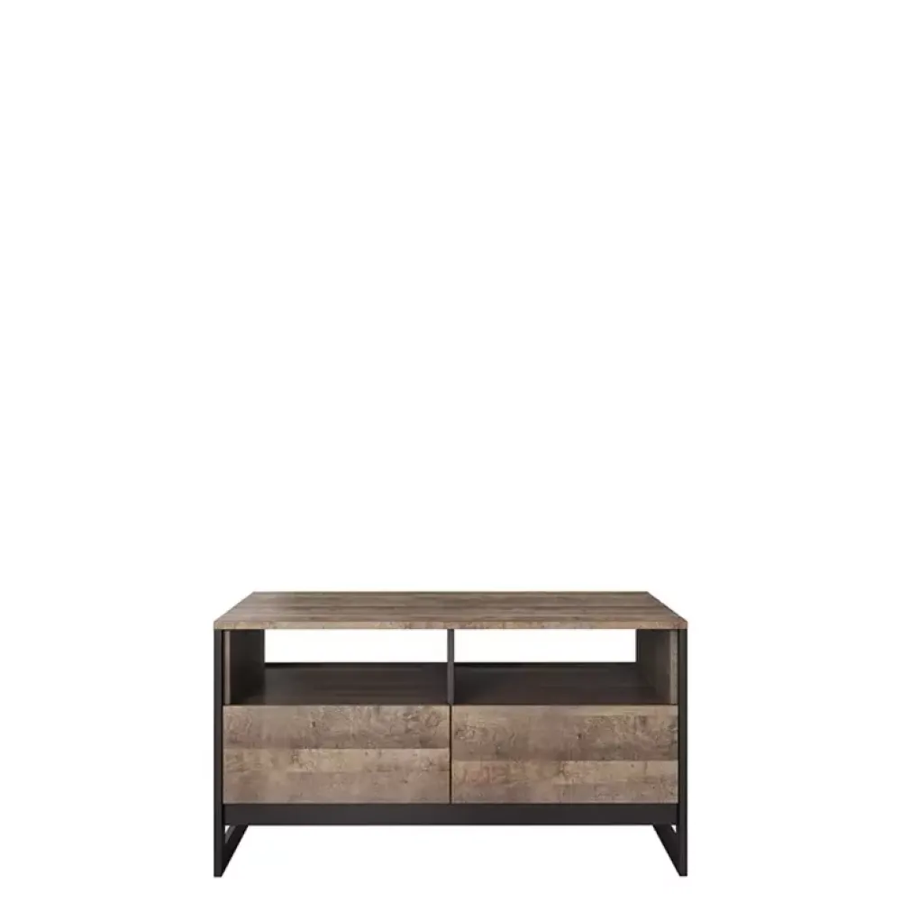 Ława Denar jest meblem bardzo praktycznym, o czym świadczą zastosowane w niej rozwiązania. Ten stolik kawowy to nie tylko mebel ładnie prezentujący się, przy którym wypijesz kawę z gośćmi. Ława posiada dwie funkcjonalne szuflady, w których zastosowano prowadnice kulkowe z pełnym wysuwem, więc schowasz w nich ulubione czasopisma, czy kredki i kolorowanki swojej pociechy. Dodatkowym atutem tej ławy są dwie półki znajdujące się pod blatem, gdzie odłożysz pilot, czy telefon. Ława osadzona jest na loftowych płozach, które nadają całości oryginalnego wyrazu.