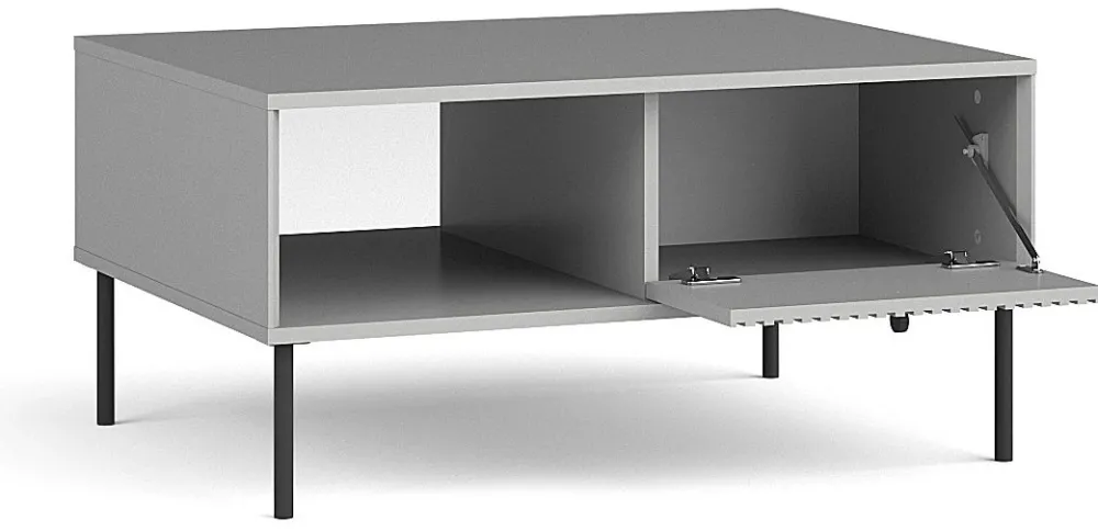 - Szary stolik kawowy IRYS z ryflowanymi frontami MDF i czarnymi, metalowymi nogami łączy elegancję z praktycznością. Pojemna szafka i półka zapewniają miejsce na przechowywanie, a nowoczesny design doskonale uzupełni aranżację salonu w stylu loft.