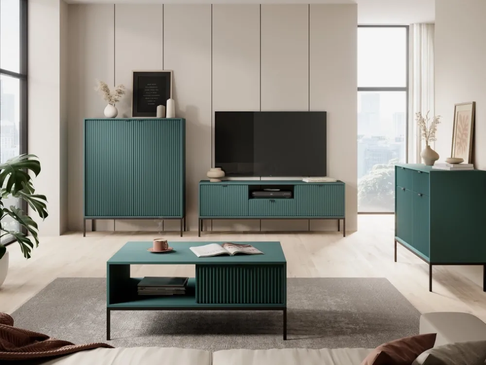 Wygląd tego stolika kawowego odzwierciedla najnowsze trendy w designie wnętrz. Ryflowane fronty oraz odważna kolorystyka sprawia, że stolik kawowy doskonale komponuje się z różnorodnymi aranżacjami salonów. Jego powierzchnia, wykonana z wysokiej jakości materiałów, zachwyca wyrafinowanym wykończeniem, dodając pomieszczeniu nowoczesnego charakteru.