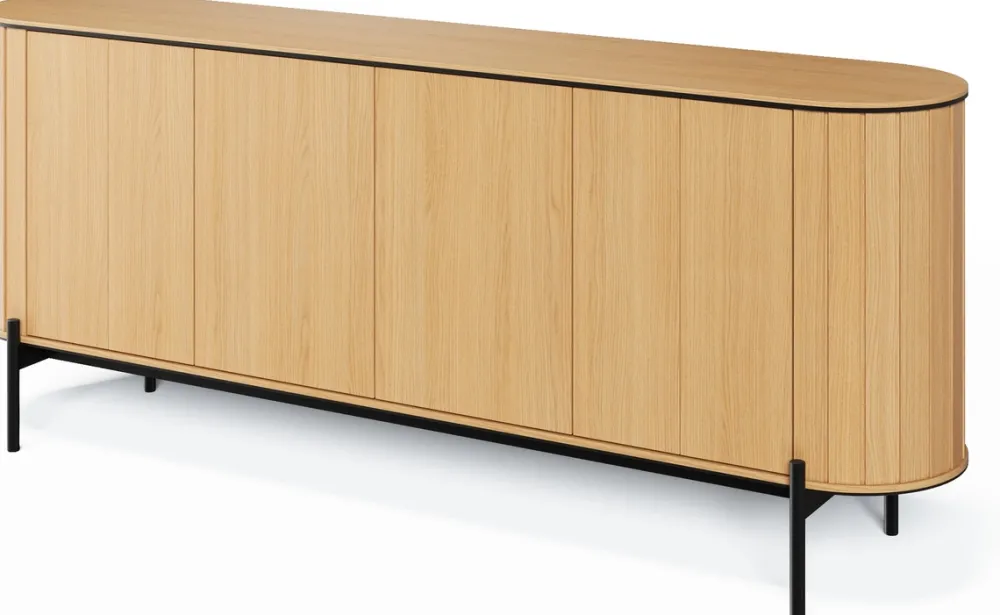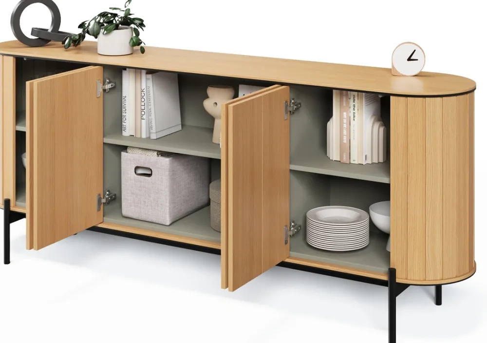 Wysoka komoda na nóżkach ROTTO, oferuje sporo miejsca do przechowywania. Będzie ona idealna do ukrycia różnych przedmiotów codziennego użytku. Szeroka komoda z czterema drzwiami to doskonałe rozwiązanie do przechowywania większych rzeczy, a jej prosta forma i naturalne wykończenie wnoszą ciepło do wnętrza. Szafka RTV z dwoma otwartymi półkami to funkcjonalny mebel, który świetnie sprawdzi się jako centrum rozrywki w salonie, umożliwiając wygodne umiejscowienie sprzętu audio-wideo.