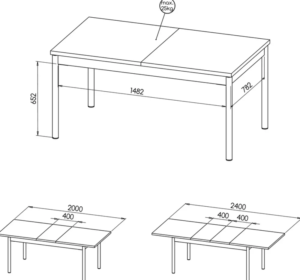 - Stół posiada dwie dodatkowe wkładki po 40 cm, umożliwiające rozszerzenie blatu do długości 240 cm.