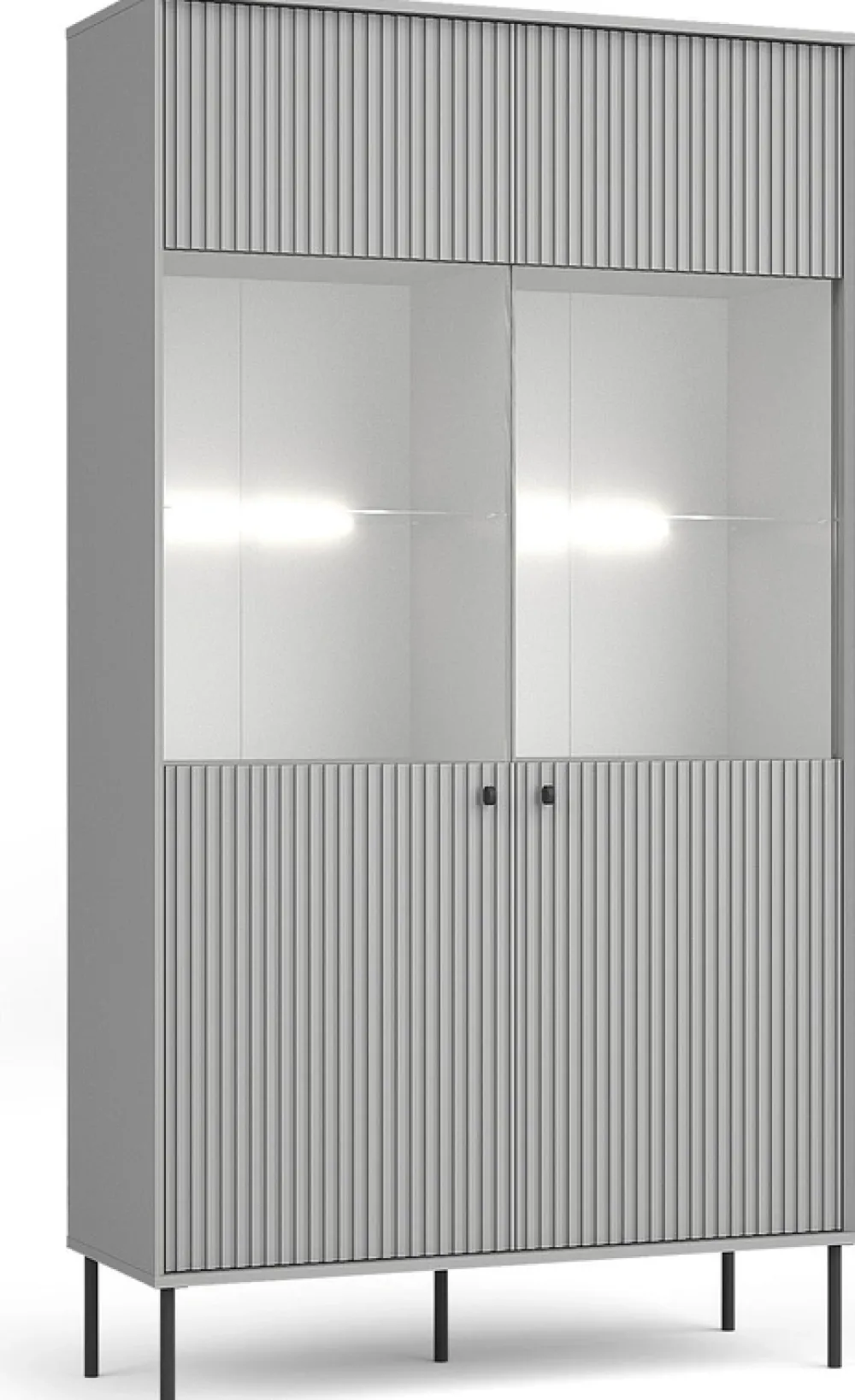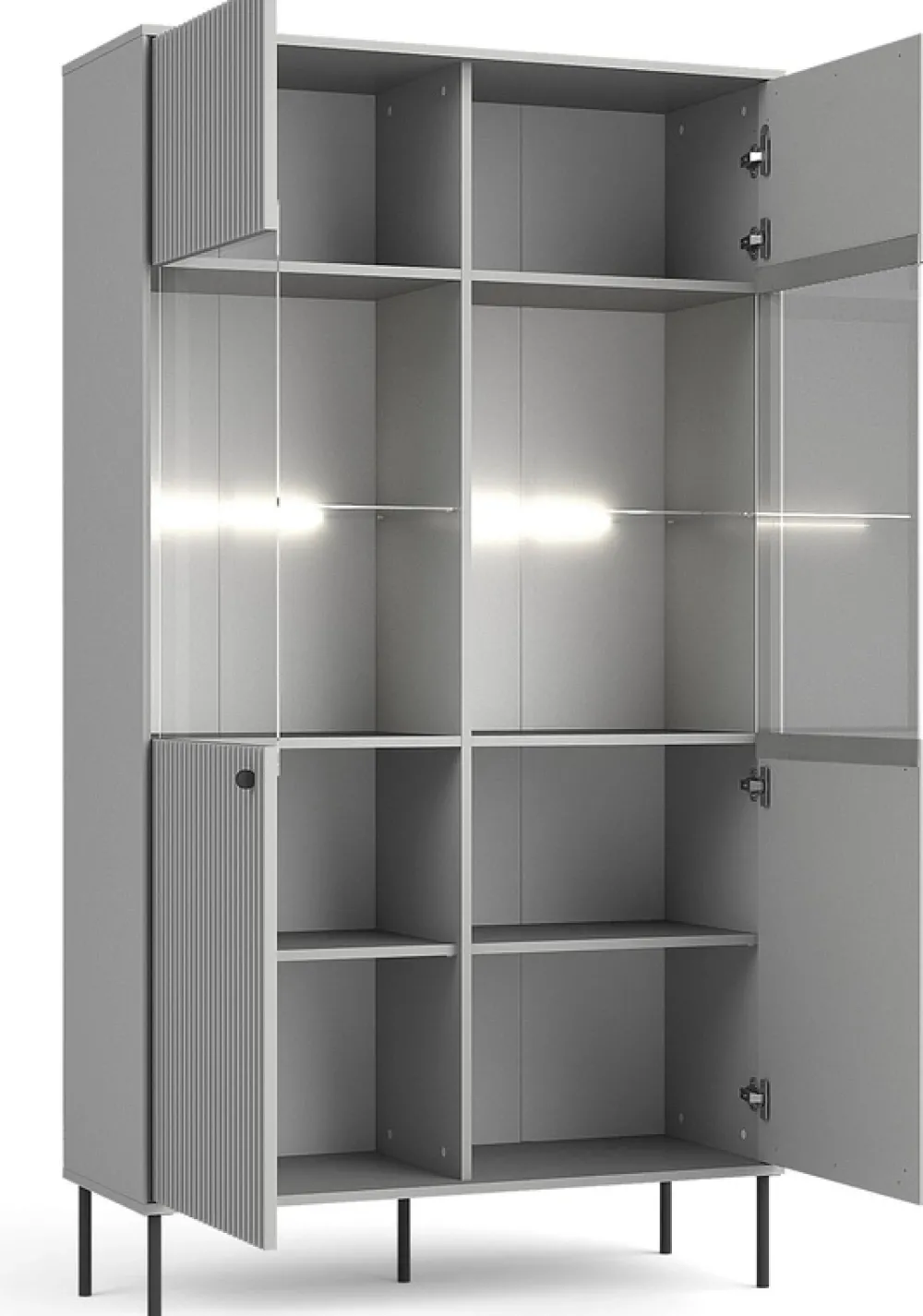 Loftowy charakter podkreślają czarne metalowe detale i ryflowane wykończenia frontów. Dzięki temu zestaw doskonale wpasuje się zarówno w nowoczesne wnętrza, jak i aranżacje w klimacie industrialnym. Szary kolor wprowadza do przestrzeni spokój, a jednocześnie jest świetną bazą do łączenia z drewnem, szkłem czy intensywnymi akcentami kolorystycznymi.
