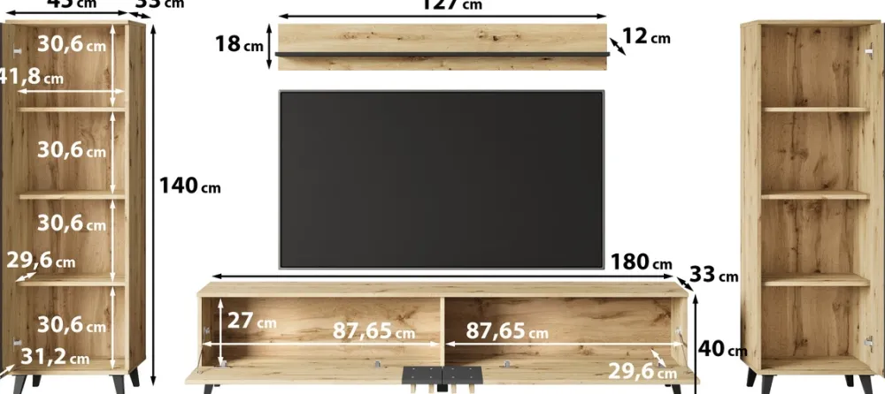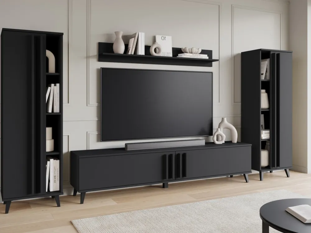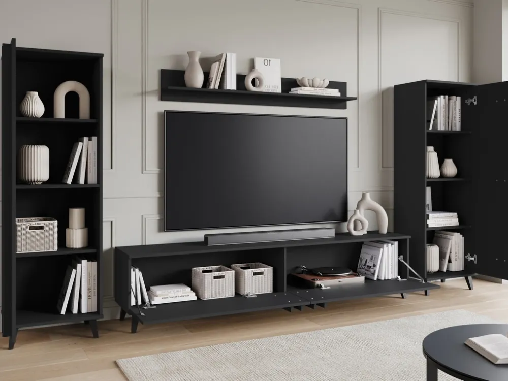 - Zestaw mebli HOMELY to dwa nowoczesne słupki z czarnym akcentem, szafkę RTV z drewnianymi uchwytami oraz półkę wiszącą o długości 127 cm. Stabilna konstrukcja, designerskie wykończenia i ciche zawiasy puszkowe zapewniają komfort i funkcjonalność.