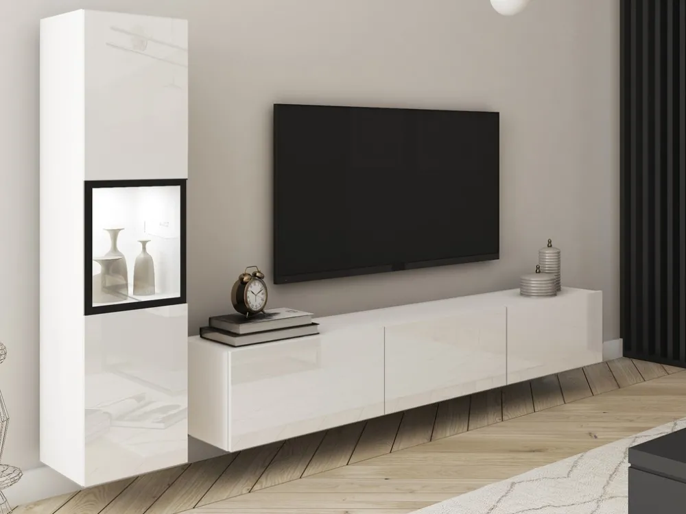 Meblościanka biała BRAVIN to doskonałe połączenie nowoczesnego designu i praktycznego zastosowania. Jej połyskujące fronty, wykończone hartowanym szkłem, oraz opcja montażu wiszącego lub stojącego sprawiają, że łatwo dopasujesz ją do każdego wnętrza. Idealna do salonu, gdzie estetyka idzie w parze z funkcjonalnością.