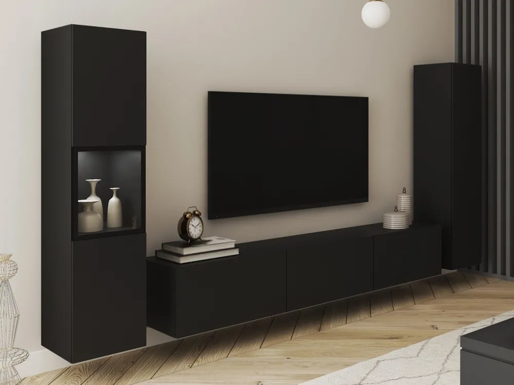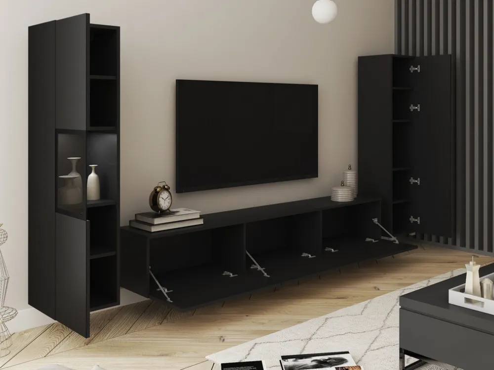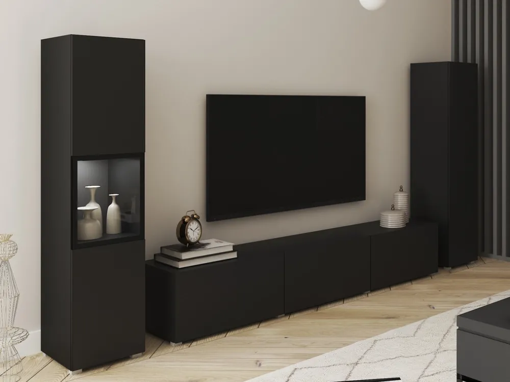 - Meblościanka BRAVIN w kolorze czarny grafit mat to elegancki zestaw z witrynami i szafką RTV. Wykonana z laminowanej płyty z obrzeżami ABS, frontami bez uchwytów i hartowanym szkłem. Matowe fronty. Możliwość montażu wiszącego lub stojącego.