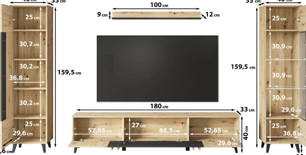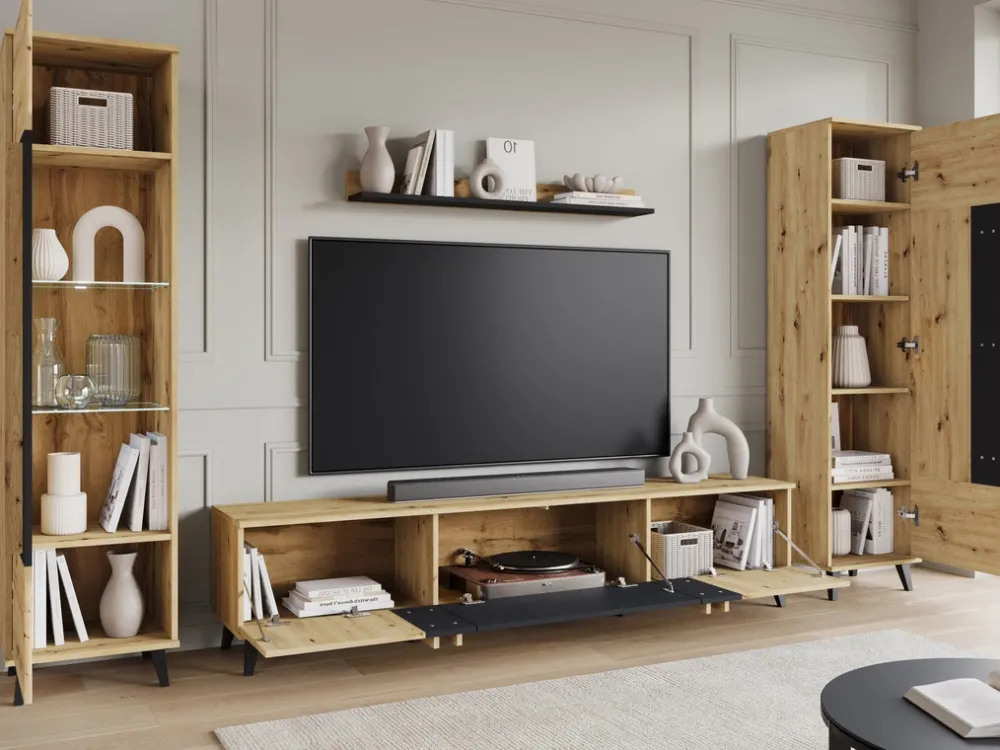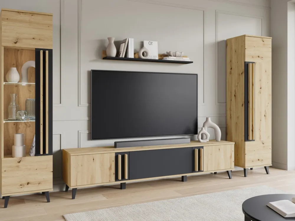 Pod telewizor idealnie sprawdzi się szafka RTV o szerokości 180 cm z trzema pojemnymi półkami, która pomieści nie tylko telewizor do 70″, ale również konsole, dekodery czy kolekcje filmowe. Pięknie prezentuje się dzięki czarnemu akcentowi na froncie i uchwytach z lameli w kolorze dębu artisan.