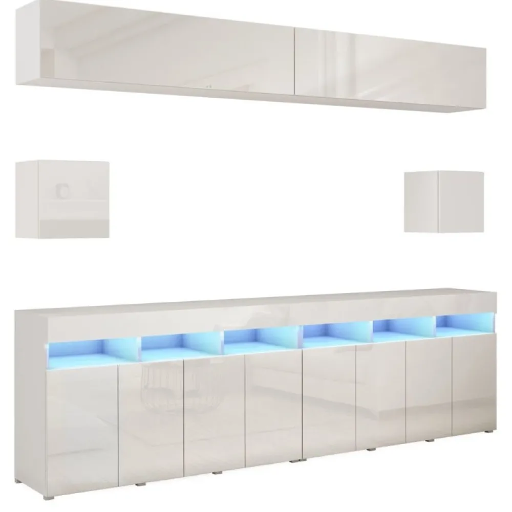 - Dwie nowoczesne komody do salonu w zestawie z barkami i szafkami wiszącym.