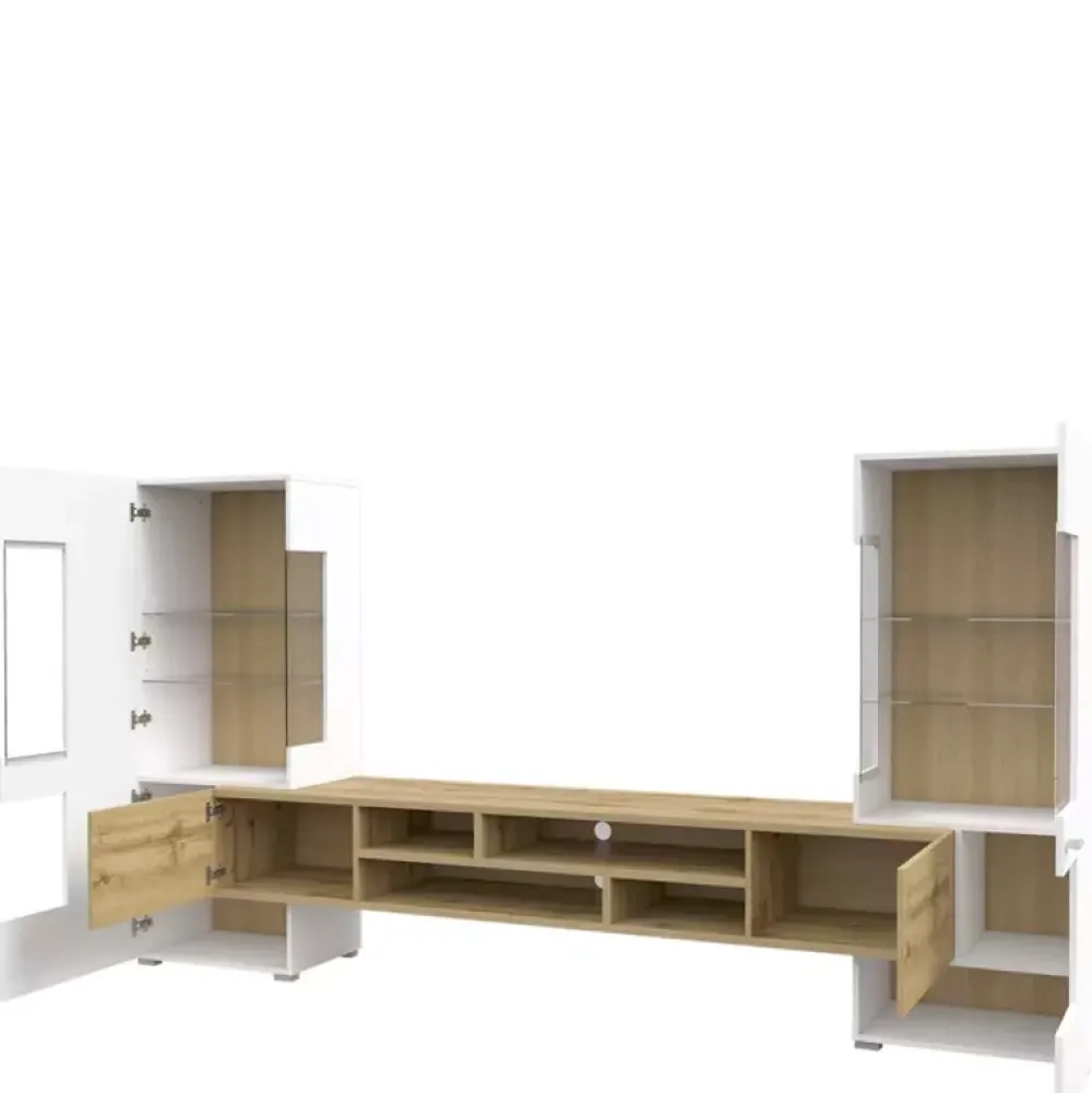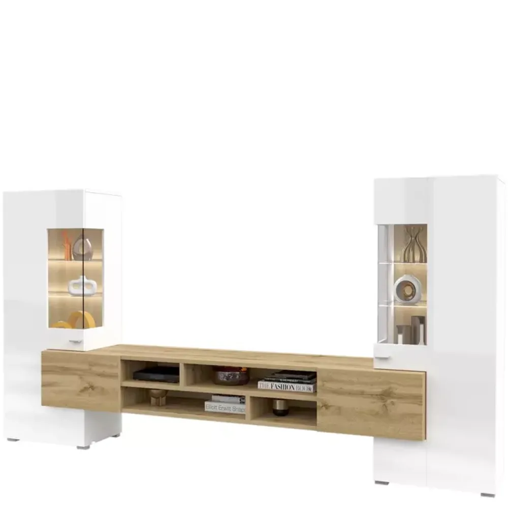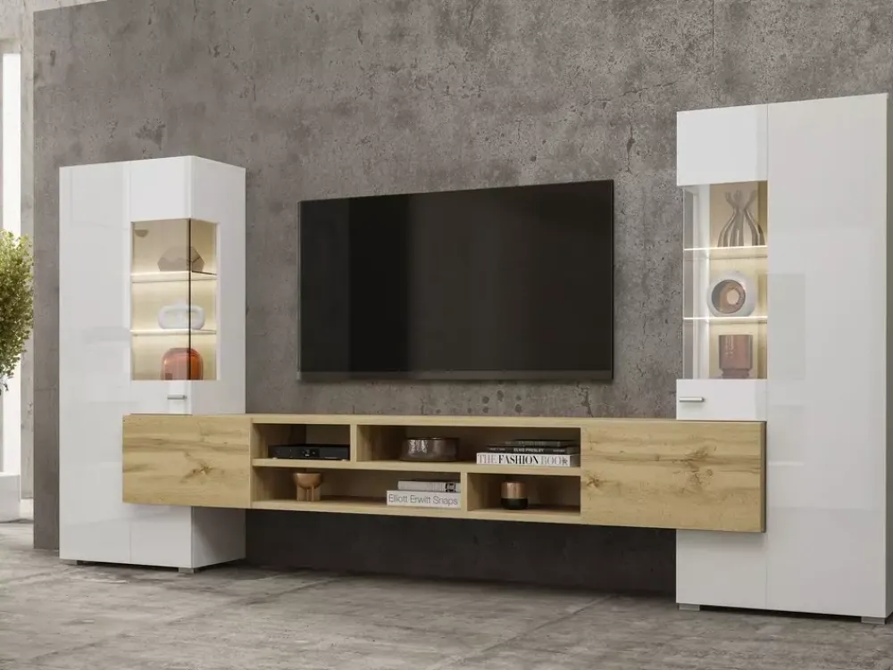 Meblościanka CAMBODE to propozycja wykonana w nowoczesnej oraz ponadczasowej stylistyce, dzięki której w znakomity sposób znajduje swoje miejsce we współczesnych aranżacjach salonów oraz pokoi dziennych. W meblościance swoje miejsce znalazły dwie witryny, które posiadają dwie szklane półki, znajdujące się za szybą. Natomiast pod nimi swoje miejsce znalazły poziomy, które dzięki położeniu za pełną częścią drzwi doskonale sprawdzą się do umieszczenia przedmiotów, które chcemy ukryć przed światłem dziennym. Natomiast szafka RTV posiada drzwi po lewej i prawej stronie oraz otwarte poziomy w swojej centralnej części, które doskonale sprawdzą się do umieszczenia drobnych dekorów oraz dodatków. Dodatkowo szklane półki witryn posiadają możliwość montażu akcesoryjnego oświetlenia, które znajdziesz poniżej w sekcji „POLECANE”.