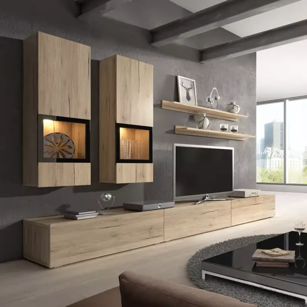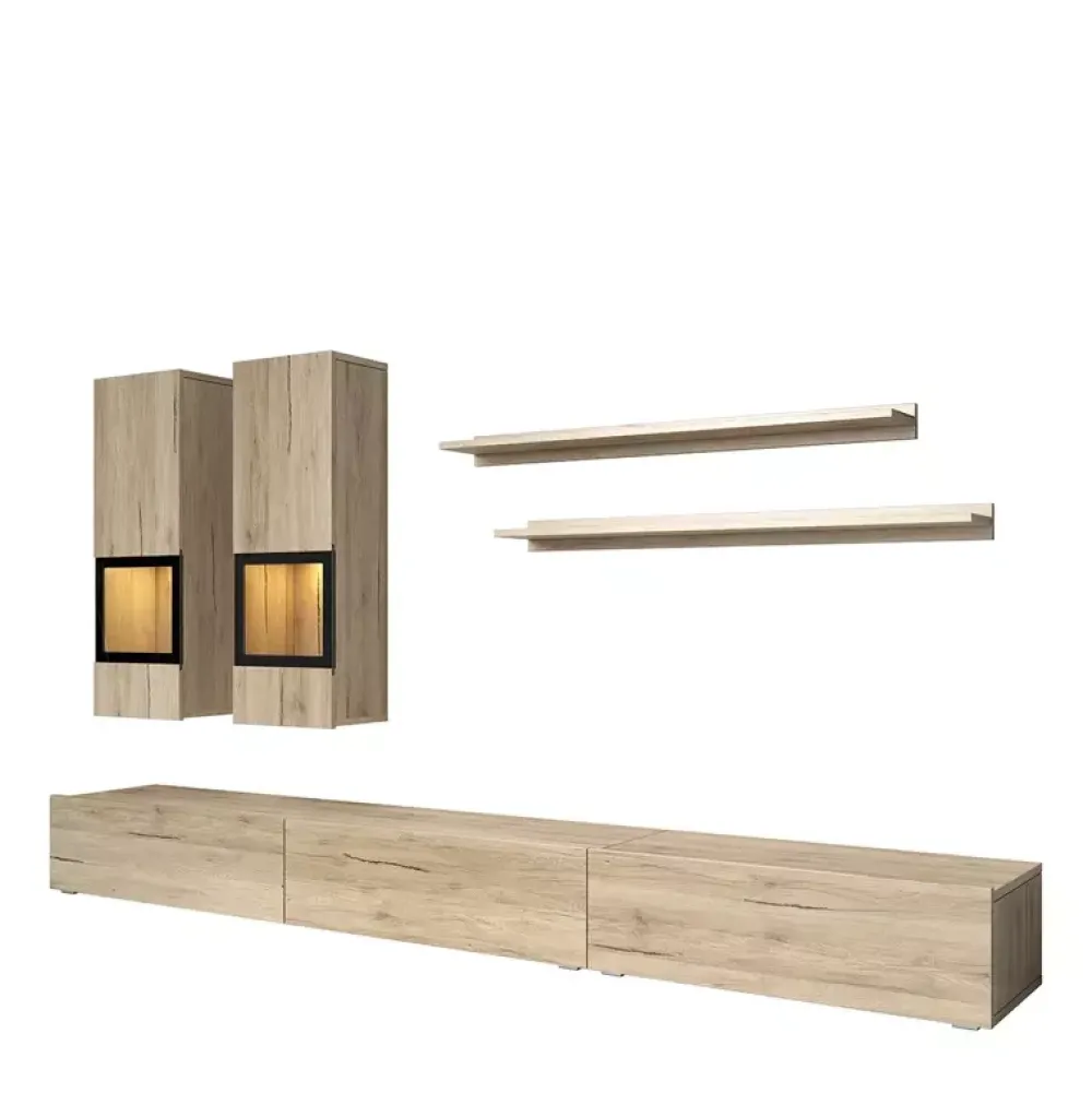 - Zestaw mebli do salonu o szerokości 270 cm składający się z dwóch witryn, dwóch półek oraz szafki RTV