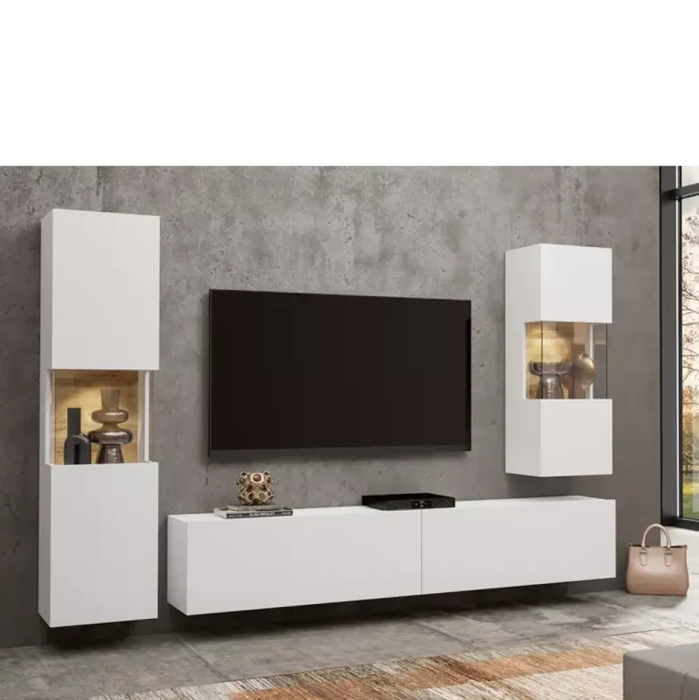 Meblościanka AVENTELI to propozycja wykonana w białym kolorze oraz nowoczesnej stylistyce, dzięki której w doskonały sposób odnajduje się we współczesnych aranżacjach salonów. W skład meblościanki wchodzi mała witryna oraz wysoka witryna, która posiada liczne półki znajdujące się za pełną częścią drzwi, oraz półkę za przeszkloną powierzchnią. Nie zabrakło również szafki RTV wyposażonej w drzwi, za którymi znajdują się cztery komory pozwalające umieścić część akcesoriów.
