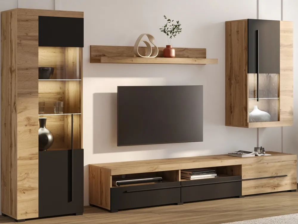 Zastanawiasz się, czy meblościanka sprawdzi się w mniejszym salonie? Dzięki przemyślanemu układowi i kompaktowym głębokościom, zestaw świetnie odnajdzie się także w średnich i mniejszych przestrzeniach, nie przytłaczając ich wizualnie.