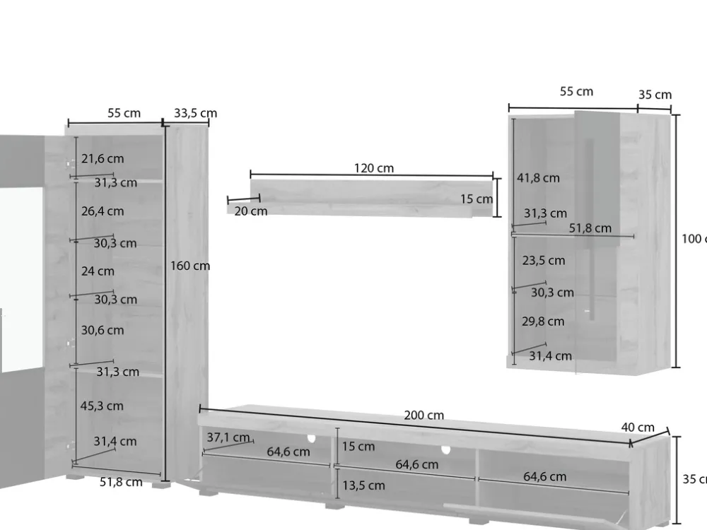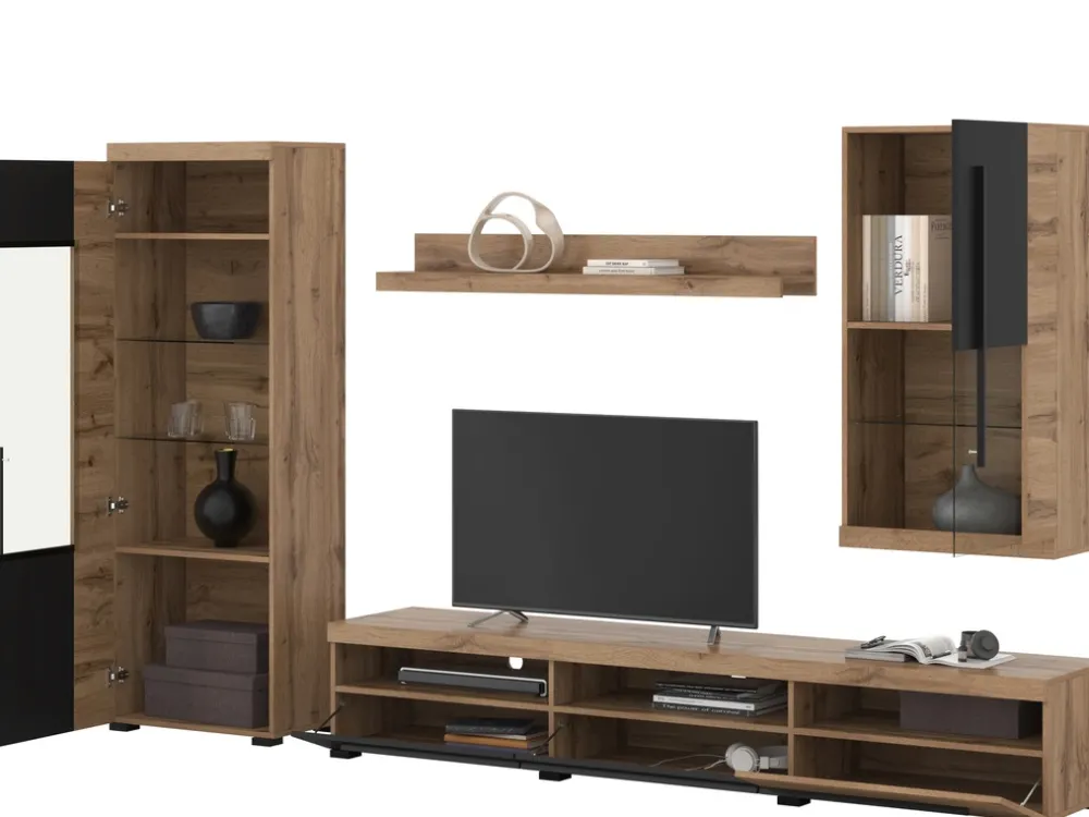 Zestaw mebli do salonu został zaprojektowany z myślą o funkcjonalności i estetyce. Dzięki licznym półkom, zamykanym szafkom i przeszklonym witrynom zyskujesz nie tylko praktyczną przestrzeń, ale również stylową aranżację, która dopełni nowoczesne i industrialne wnętrza.