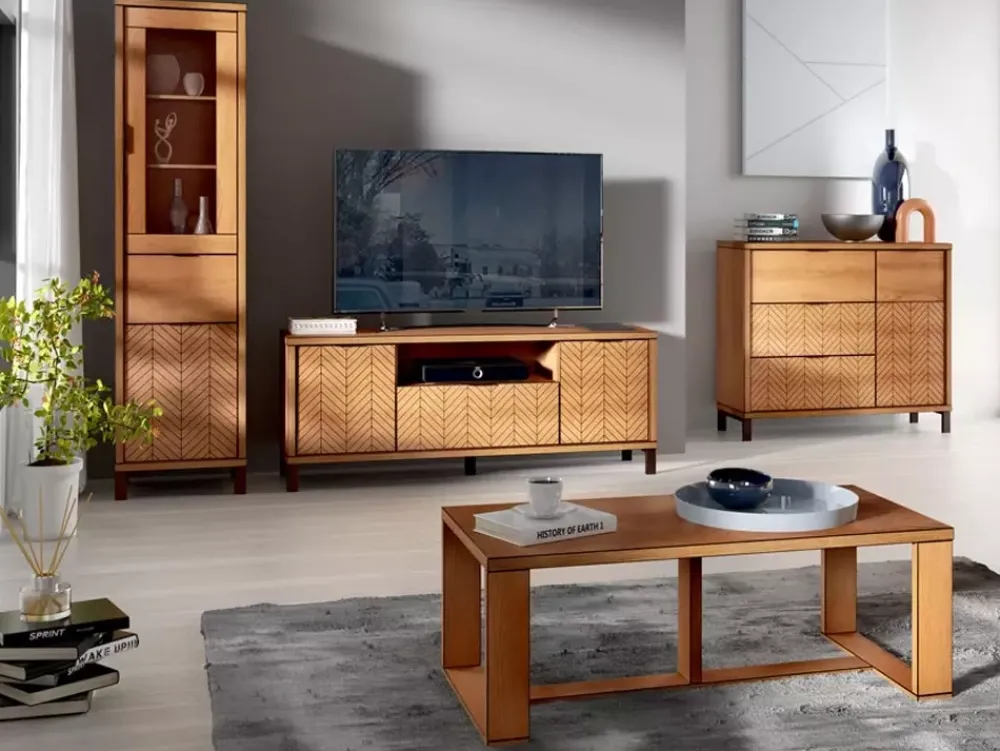 - Przytulna meblościanka do salonu FONETTI, utrzymana w ciepłym kolorze dębu karmel. W skład zestawu wchodzą elegancka komoda, witryna, szafka RTV oraz stylowa ława. Fronty mebli z wyrafinowanym frezowanym wzorem czarnej jodełki dodają charakteru i klasy.