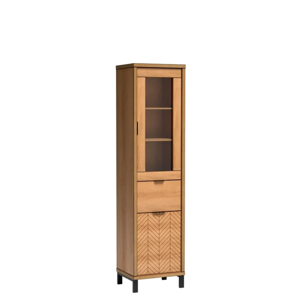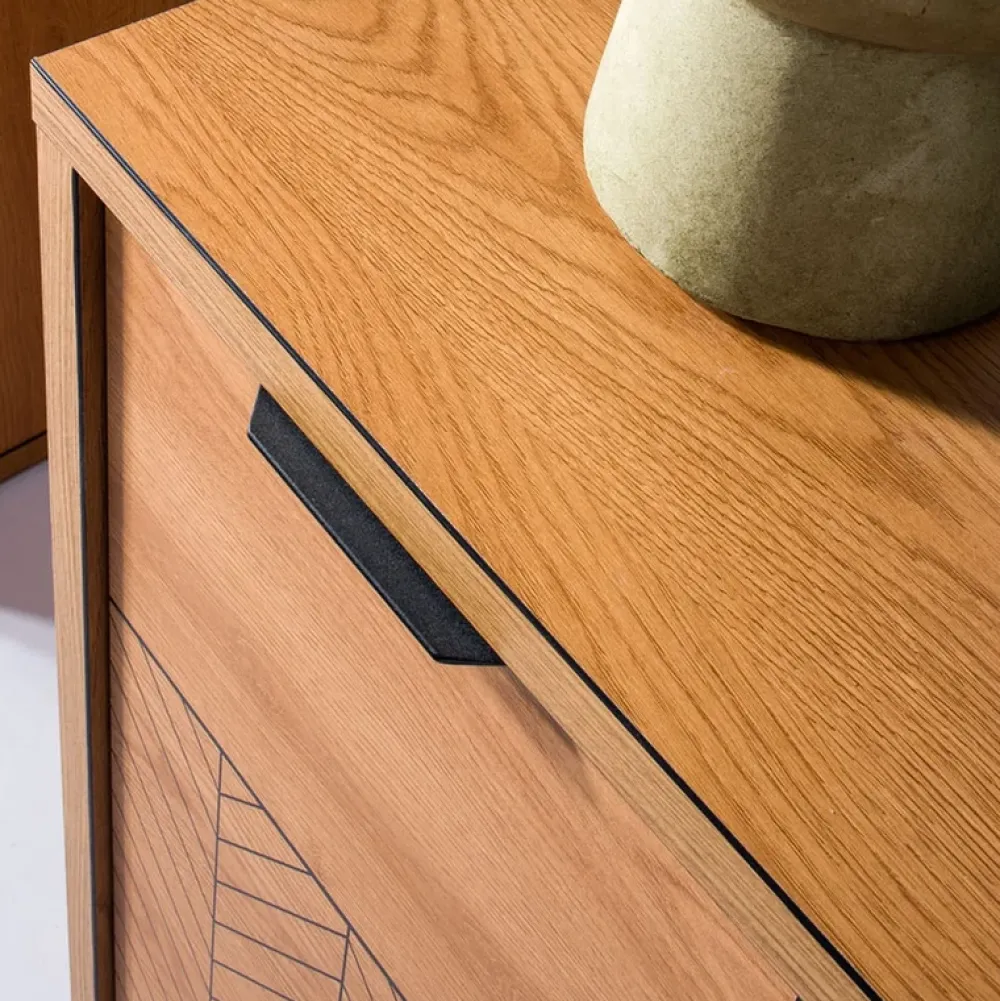 Metalowe uchwyty dodają meblom industrialnego sznytu, idealnie komponując się z kolorystyką dąb karmel. Dzięki nim korzystanie z mebli staje się niezwykle wygodne i proste.