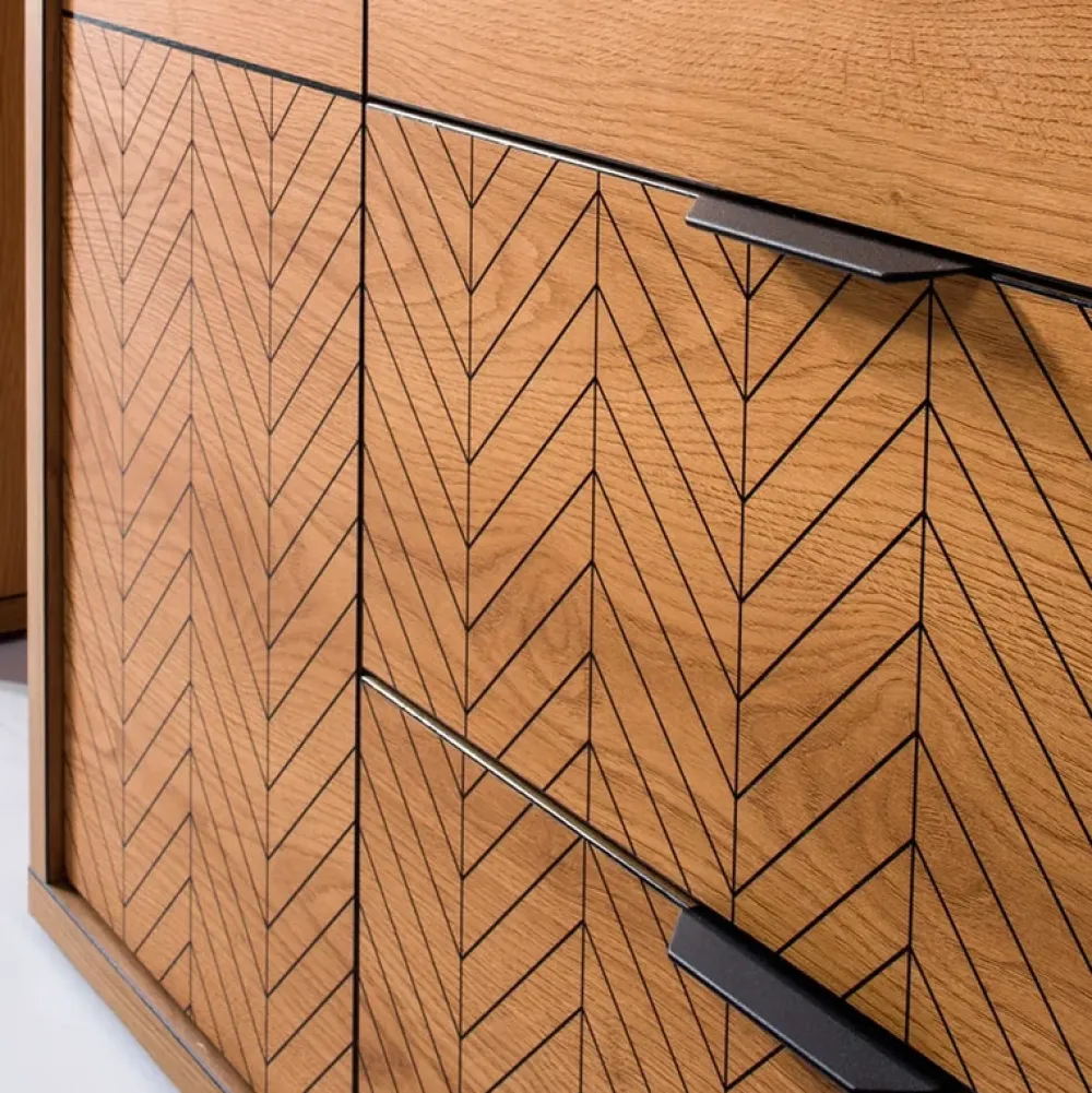 Meble w ciepłym kolorze dąb karmel nadają wnętrzu przytulności, a jednocześnie nie tracą swego nowoczesnego charakteru. Frezowany wzór na frontach w postaci czarnej jodełki to unikalny detal, który nadaje meblom oryginalności i elegancji.