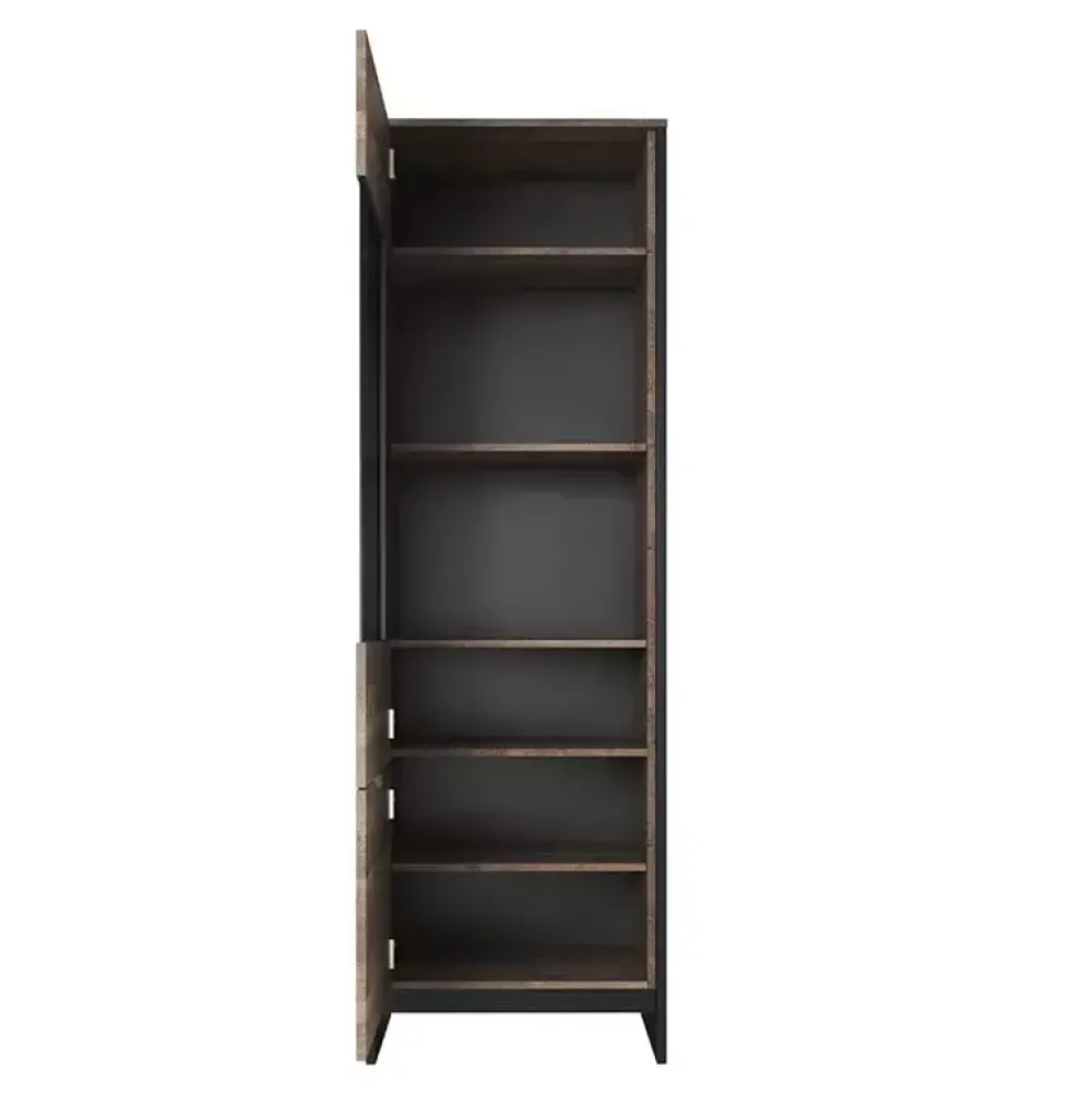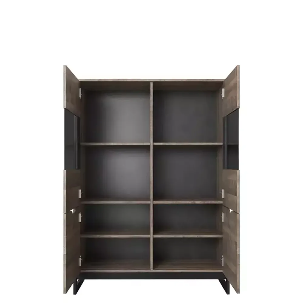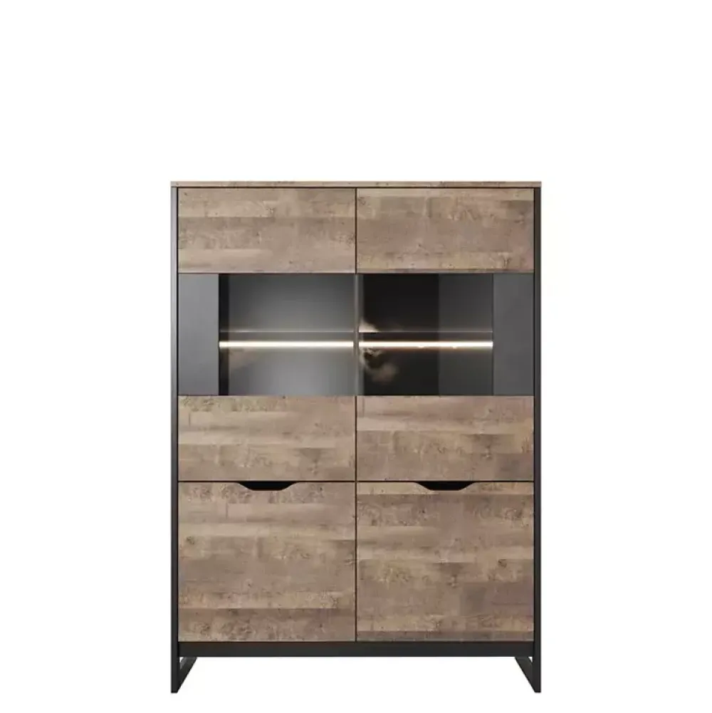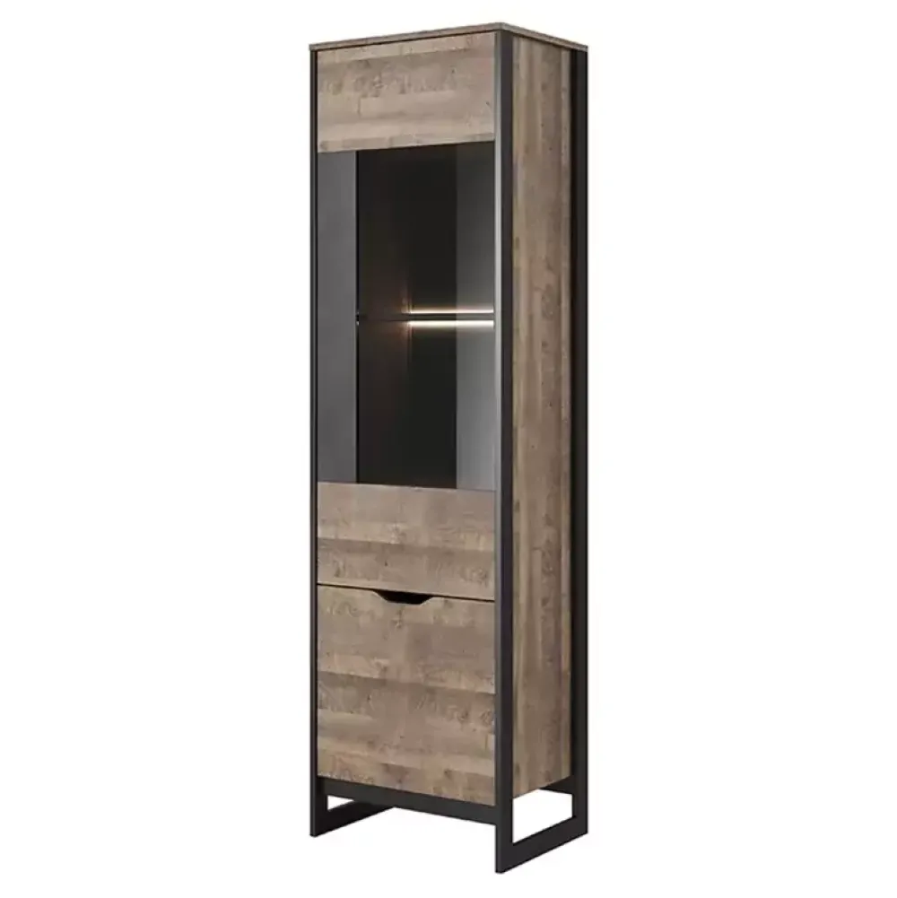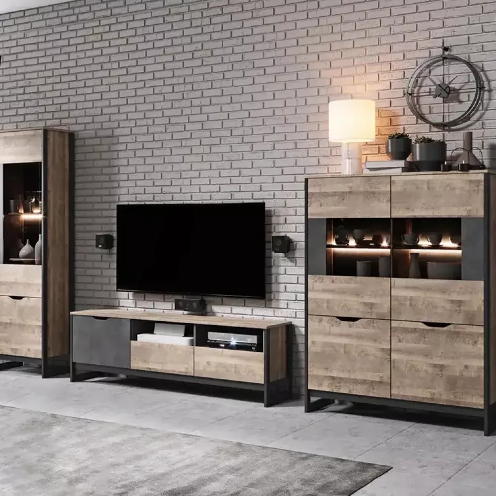 - Zestaw mebli do salonu składający się z dwóch pojemnych witryn oraz loftowej szafki rtv. Możliwość podświetlenia szklanych półek w witrynach oświetleniem led, które jest dostępne jako opcja dodatkowa.