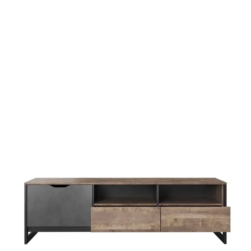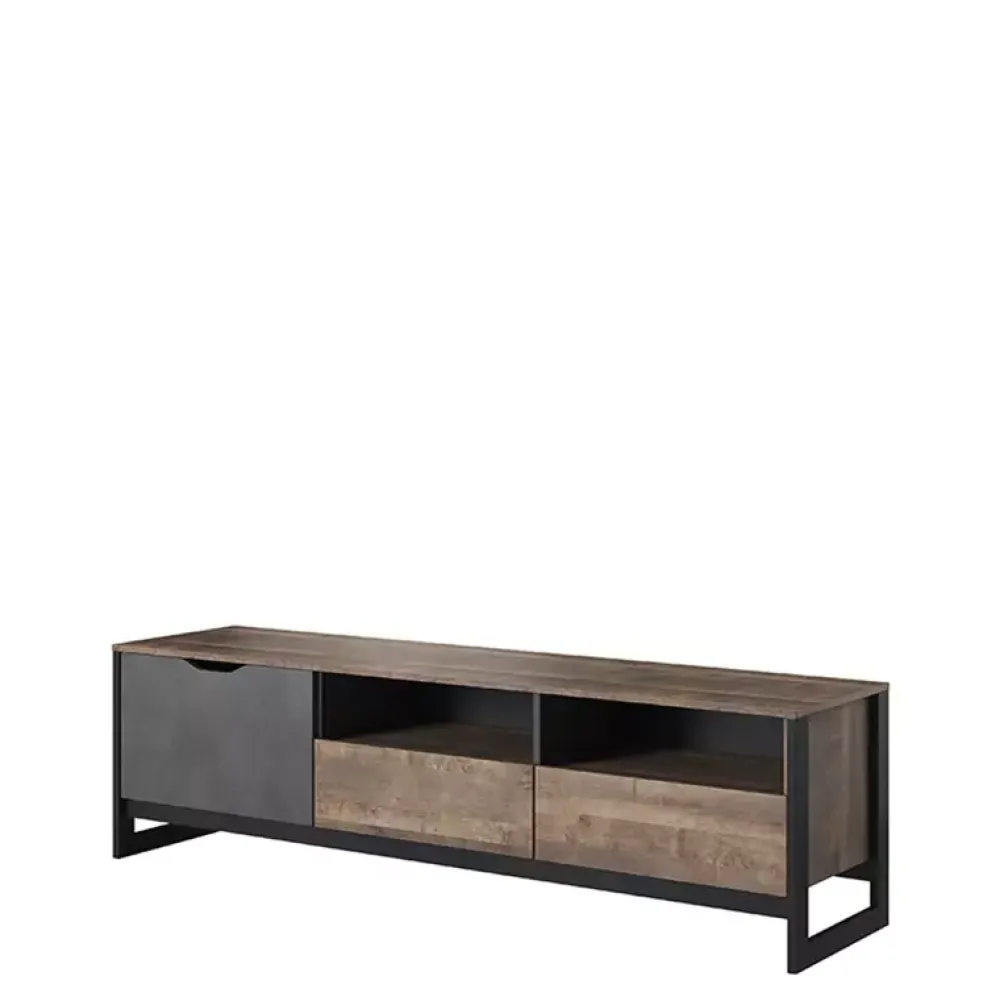 Meble loftowe Denar pomogą w stworzeniu przytulnego i funkcjonalnego wnętrza. W skład zestawu wchodzi; wysoka witryna wyposażona w pięć półek, spośród których dwie znajdują się za przeszklona wstawką – wyeksponujesz tutaj dekoracje; niższa, ale szeroka witryna jest meblem bardzo pojemnym i posiada aż osiem wnęk, w których zachowanie porządku będzie prostsze; Szafa pod telewizor wyposażona w dwie pojemne szuflady i półki na sprzęt rtv tuż nad nimi, dodatkowo stolik rtv posiada zamykany schowek, który uchyla się do dołu. Wszystkie te bryły osadzone są na pięknie prezentujących się płozach, które nadają całości niesamowitego, industrialnego charakteru.
