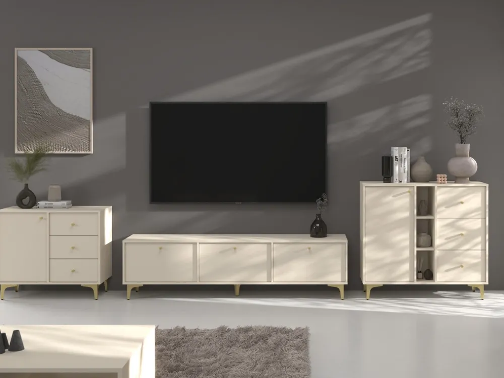 Nasza trzydrzwiowa szafka RTV to esencja nowoczesności i funkcjonalności. Zaprojektowana z myślą o nowoczesnych wnętrzach, oferuje wystarczająco dużo miejsca na przechowywanie sprzętu RTV, kabli i innych akcesoriów. Dzięki swojej konstrukcji doskonale współgra z pozostałymi elementami meblościanki.