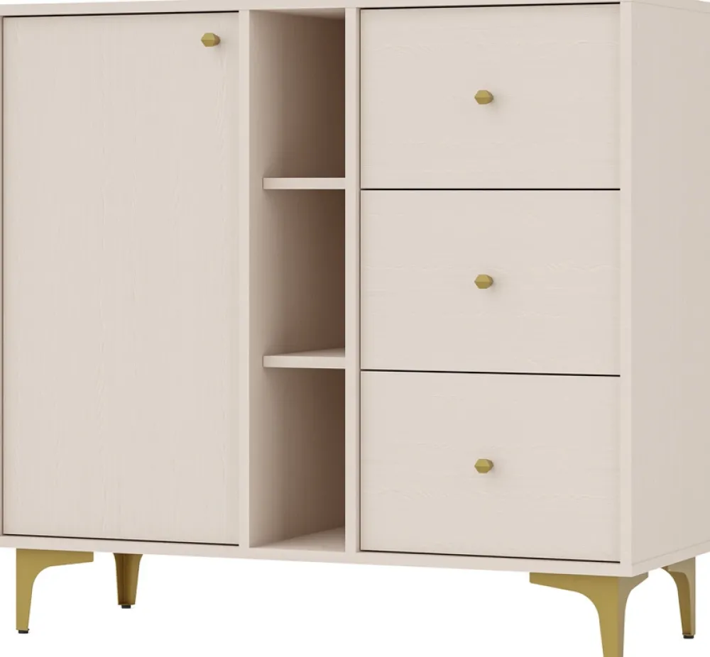 Stylowa komoda z pewnością przyciągnie wzrok swoim eleganckim designem. Po lewej stronie znajduje się funkcjonalna szafka z drzwiami, za którymi kryje się pojemna półka – idealna do przechowywania różnorodnych przedmiotów. Po prawej stronie umieściliśmy trzy praktyczne szuflady, które pomogą utrzymać porządek w Twoim salonie.