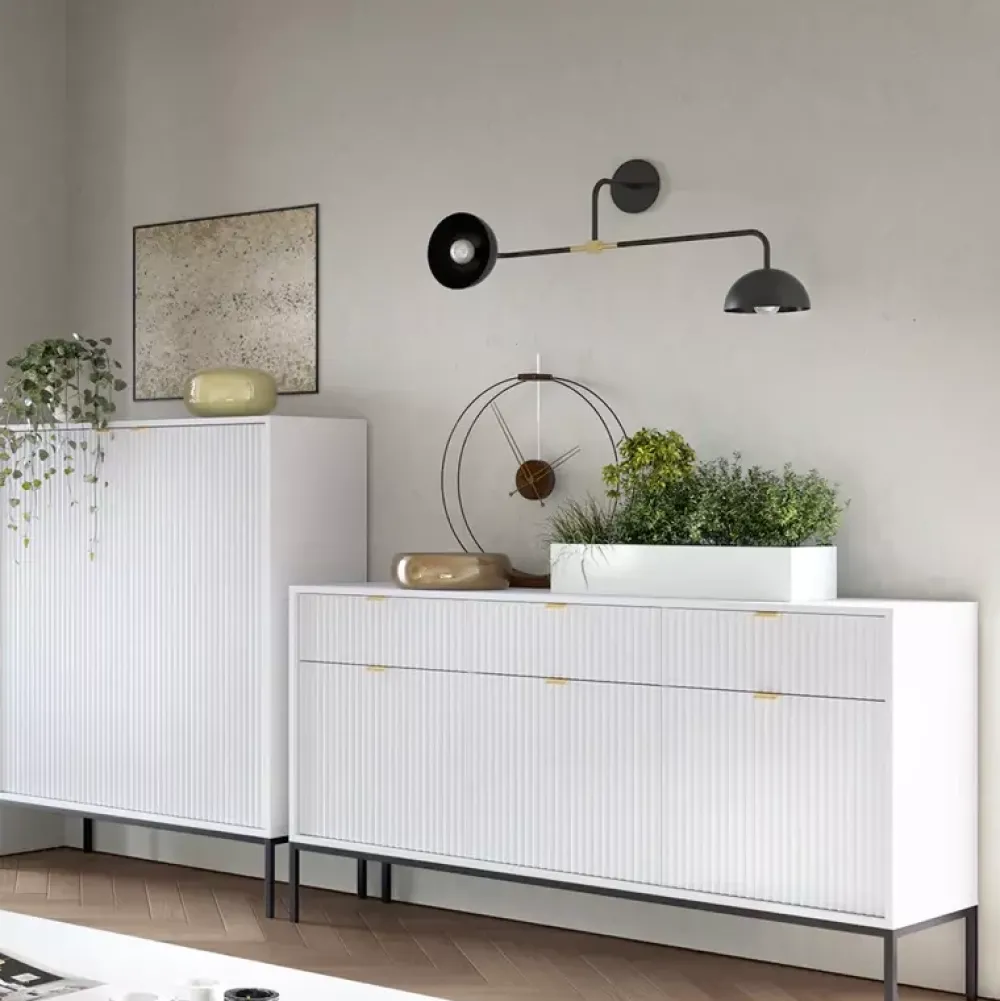 Meblościanka AVANTI jest propozycją wykonaną w nowoczesnej stylistyce, dzięki której jest niezwykle uniwersalna aranżacyjnie. Meblościanka sprawdzi się zarówno we współczesnych aranżacjach, jak i stylu glamour. Meblościanka składa się z dwóch pojemnych komód, dużej komody, w której znajdziesz liczne półki, oraz komody trzydrzwiowej, gdzie za każdymi z jej drzwi znajduje się półka, natomiast nad półkami swoje miejsce znalazły szuflady.