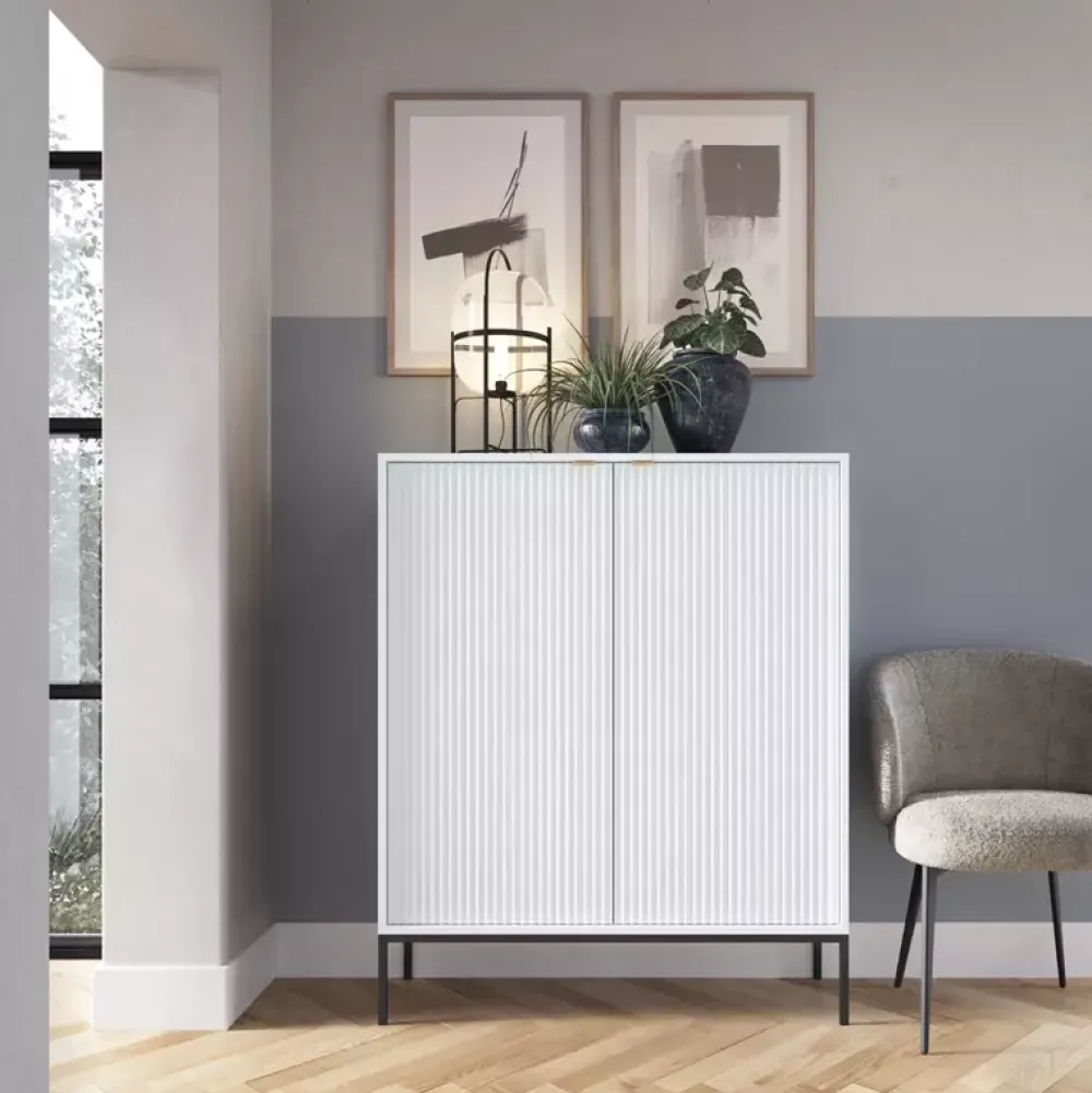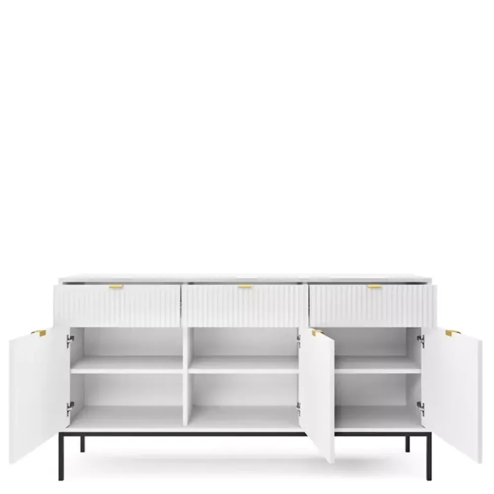 - Fronty mebli wykonane są z płyty MDF o grubości 18 mm, a dla lepszego efektu znajdują się na nich ryflowane fronty.