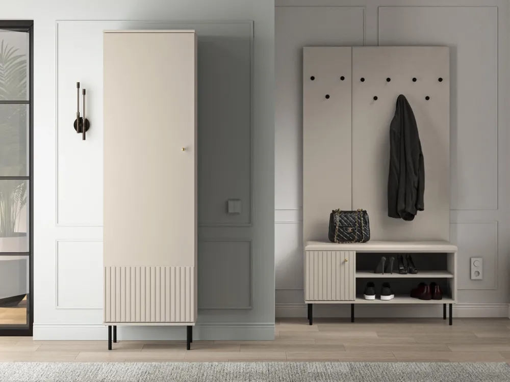 - Zestaw mebli SOPHIE do przedpokoju w odcieniu kaszmirowym łączy styl i wygodę. Zawiera szafkę z wysuwanym wieszakiem, dużą szafkę na buty, tapicerowany panel z haczykami, mały wieszak ścienny i lustro. Stylowe uchwyty podkreślają nowoczesny design.