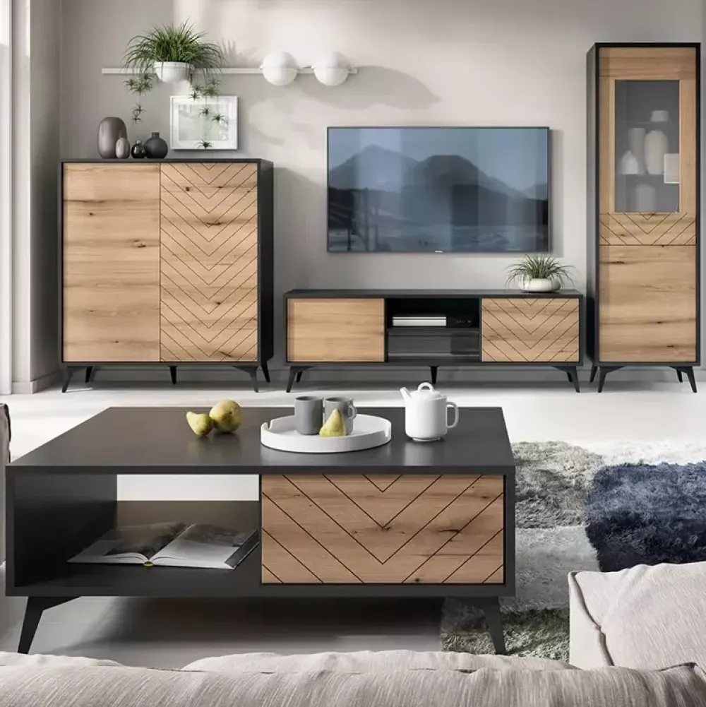 - Gotowy komplet mebli do salonu w stylu industrialnym. Przepiękny wzór jodełki na frontach mebli podkreśla indywidualny charakter tej kolekcji. W zestawie znajdują się; duża komoda, stolik kawowy, szafka rtv na nóżkach oraz wysoka witryna.