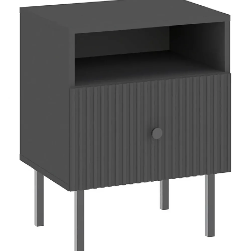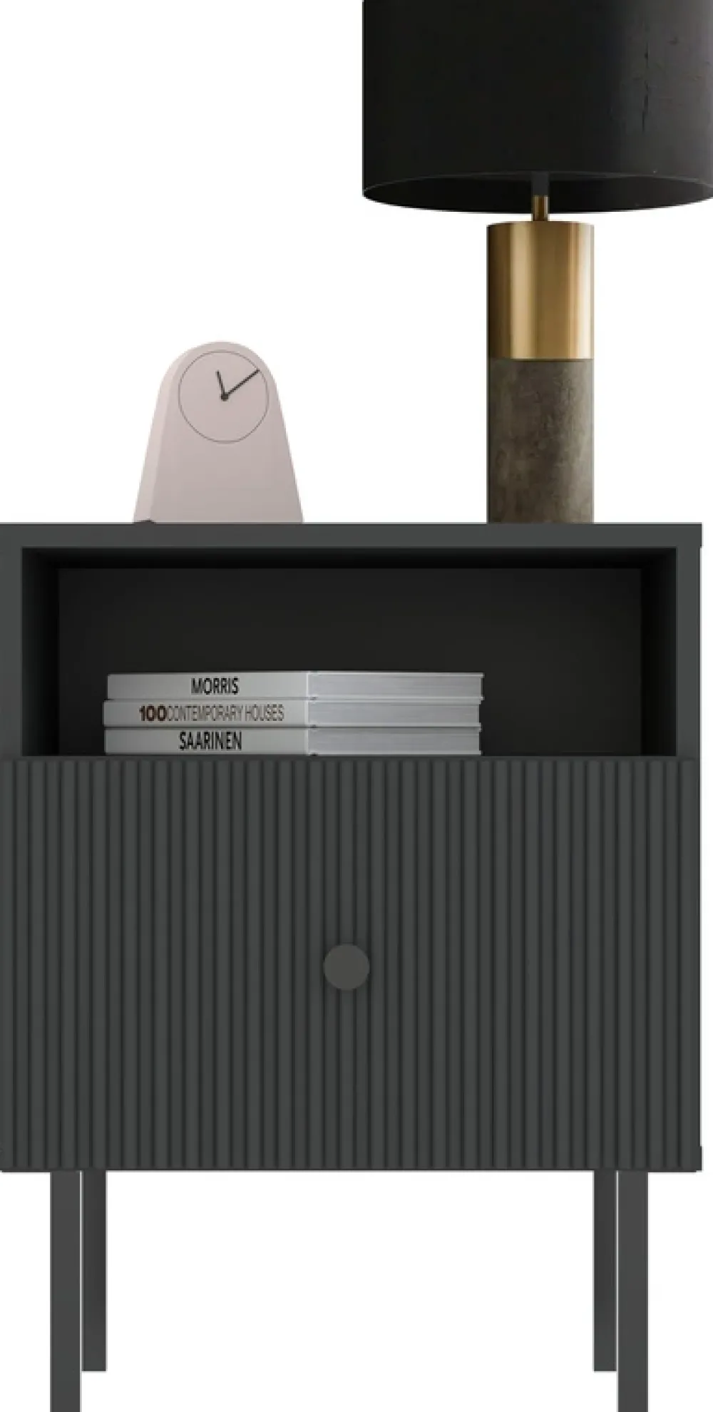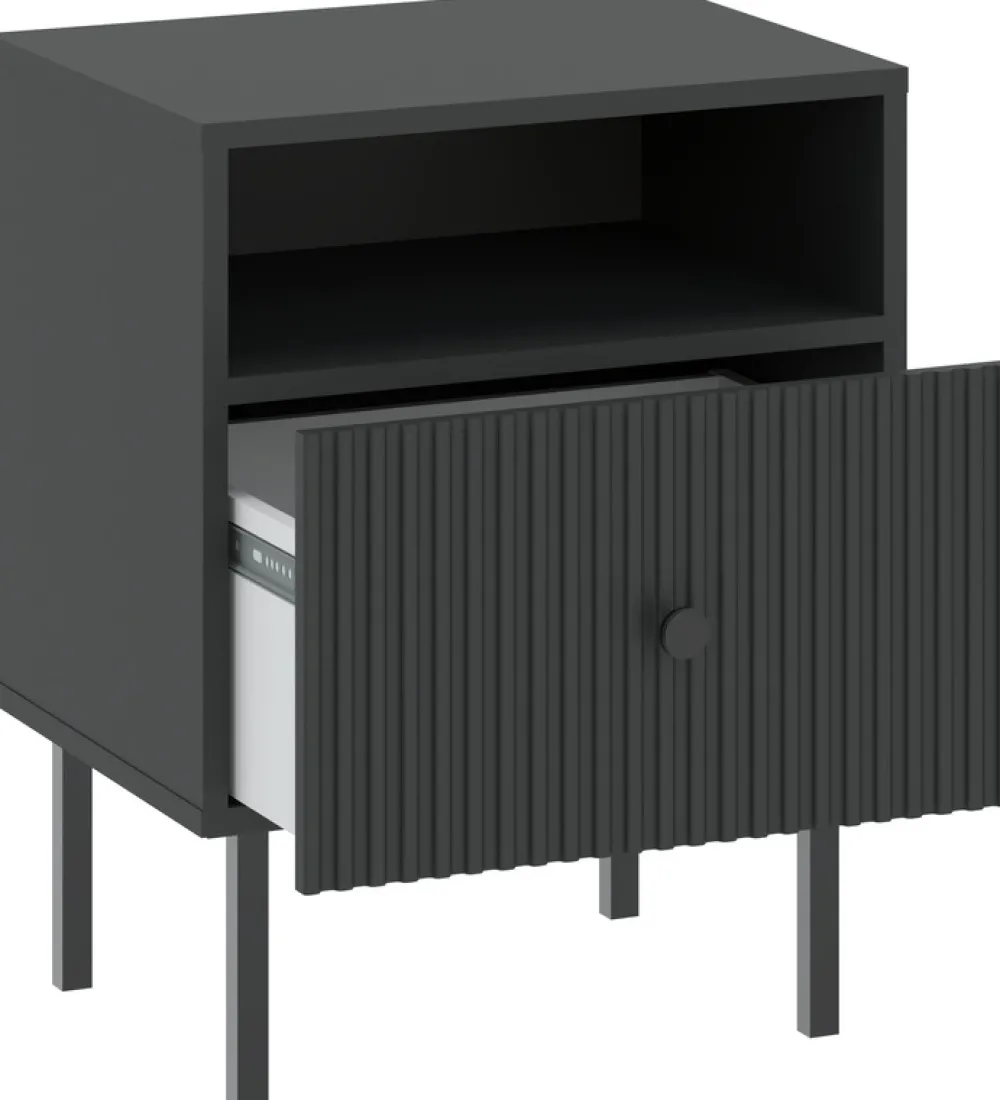 - Czarna szafka nocna VALTEO z szufladą i otwartą półką to stylowy dodatek do nowoczesnej sypialni. Metalowe nóżki, elegancki front z MDF i praktyczne przechowywanie sprawiają, że to idealne rozwiązanie obok łóżka.