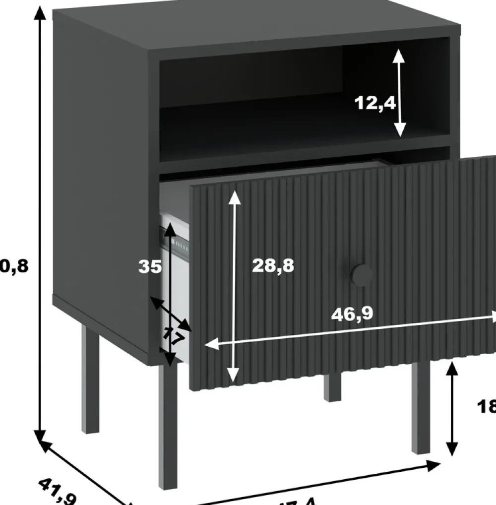 Szafka nocna do sypialni VALTEO to stylowe i funkcjonalne rozwiązanie, które doda elegancji każdej aranżacji. Jej czarna kolorystyka i metalowe nóżki tworzą modny kontrast, a przemyślana konstrukcja z szufladą i otwartą półką pozwala zachować porządek przy łóżku. To mebel, który łączy nowoczesny design z wygodą codziennego użytkowania.