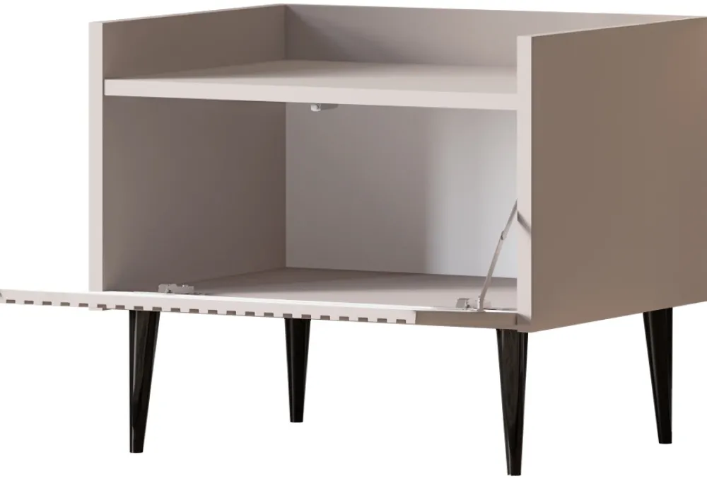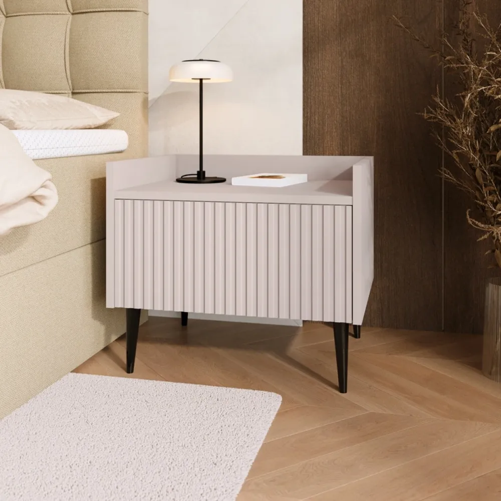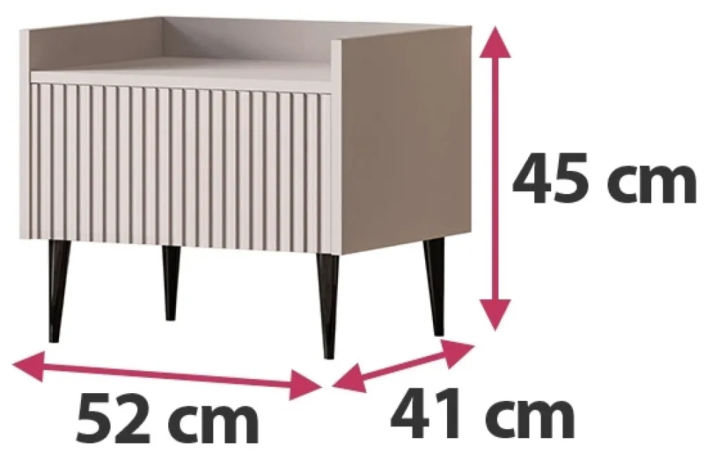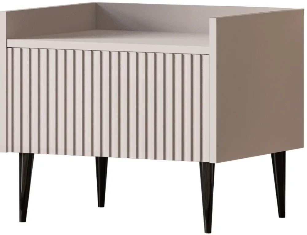 - Nowoczesna szafka nocna do sypialni ASPERO w kolorze kaszmir wyposażona została w uchylne drzwi wykonane z płyty MDF. Drzwi posiadają ryflowaną teksturę. Szafka nocna do sypialni posiada również wysokie metalowe nóżki w kolorze czarnym.