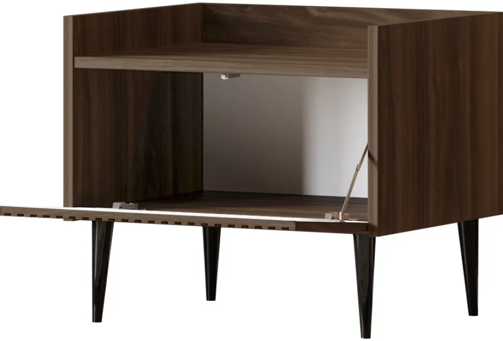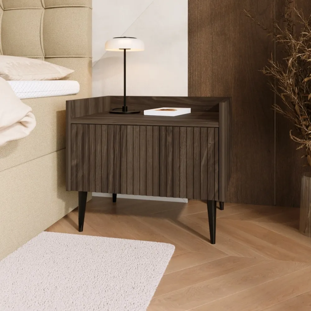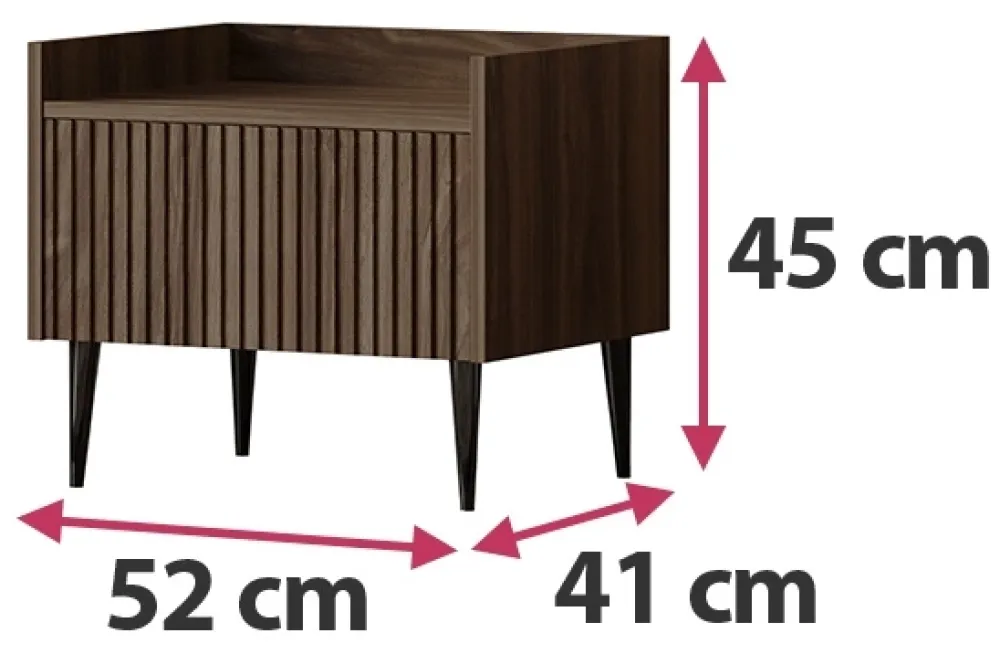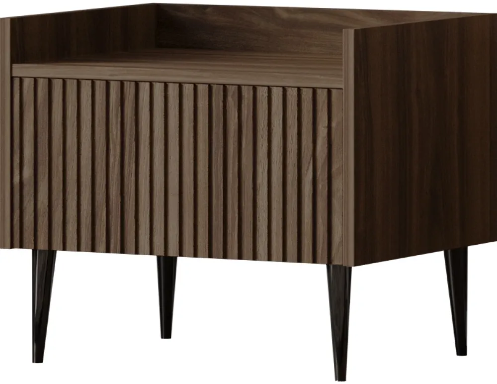 - Nowoczesna szafka nocna do sypialni ASPERO w kolorze orzech wyposażona została w uchylne drzwi wykonane z płyty MDF. Drzwi posiadają ryflowaną teksturę. Szafka nocna do sypialni posiada również wysokie metalowe nóżki w kolorze czarnym.