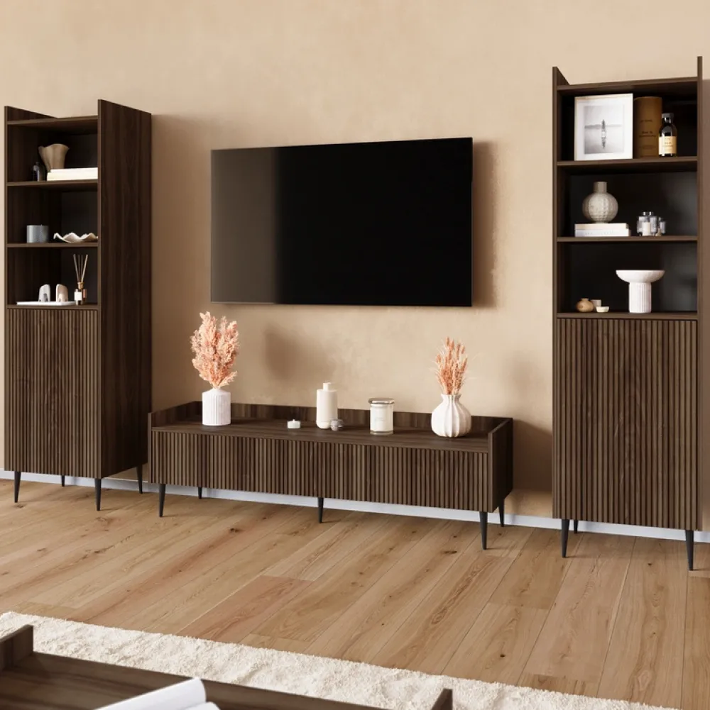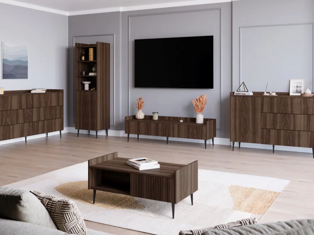 Ryflowany front o grubości 18 mm, wykonany z płyty MDF, dodaje szafce unikalnej tekstury, która przyciąga uwagę i wprowadza nieco dynamiki. Szafka osadzona jest na wysokich, czarnych metalowych nóżkach, które nie tylko dodają lekkości, ale także ułatwiają sprzątanie pod meblem. Krawędzie wykończone okleiną PCV zapewniają dodatkową trwałość, chroniąc szafkę przed codziennymi uszkodzeniami.