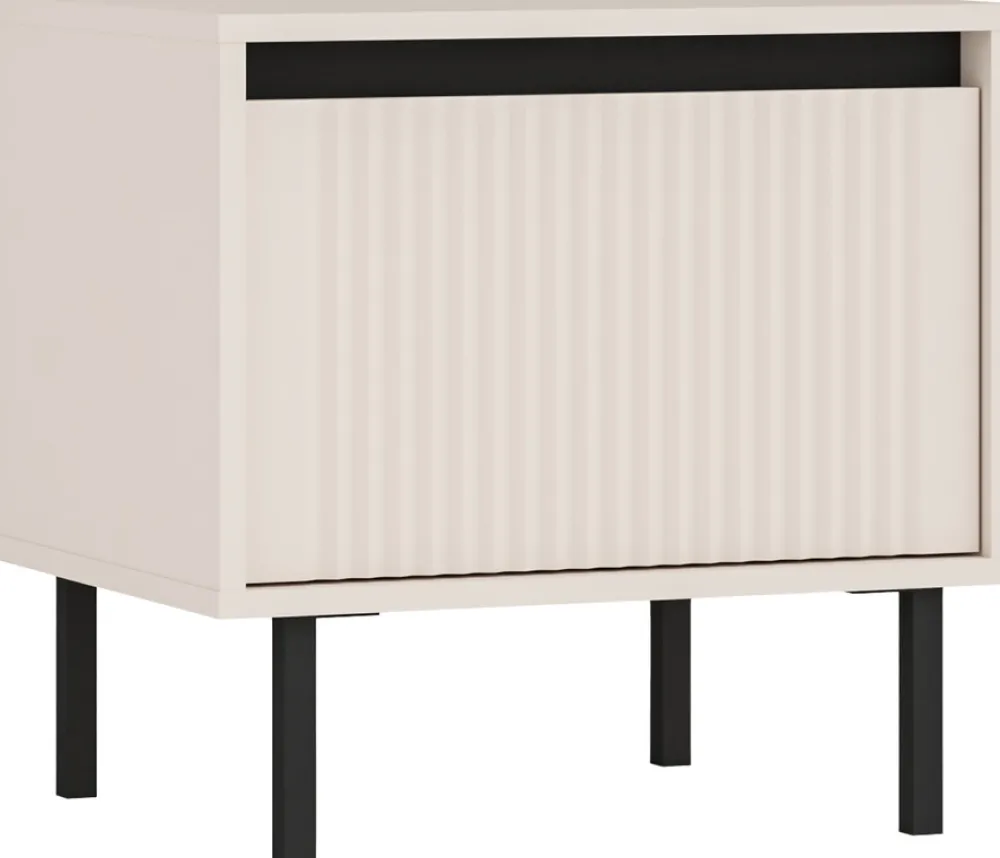 - Szafka nocna 52 cm OMEGA posiada szufladę z frezowanym frontem o grubości 16 mm, który wykonano z płyty MDF. Szafka stoi na malowanych proszkowo metalowych nóżkach o wysokości 15 cm, które pozwalają na pracę popularnych odkurzaczy samojezdnych.